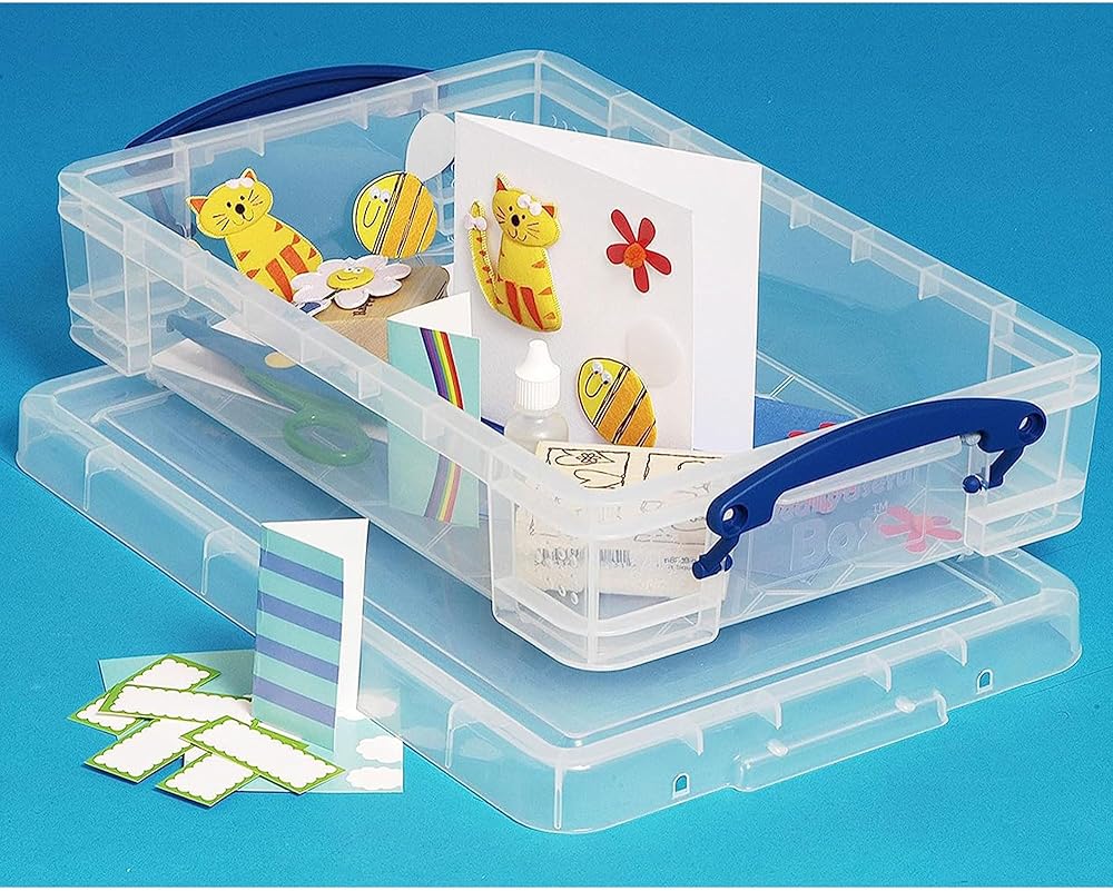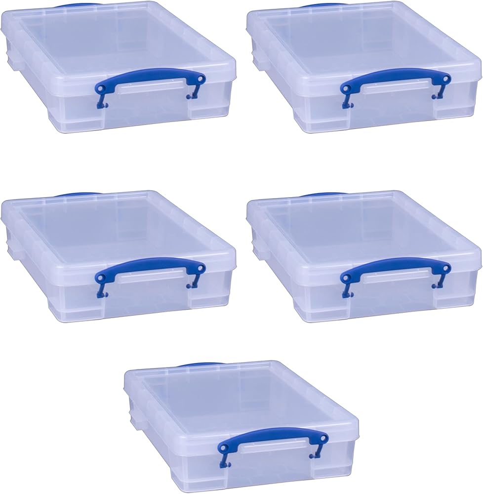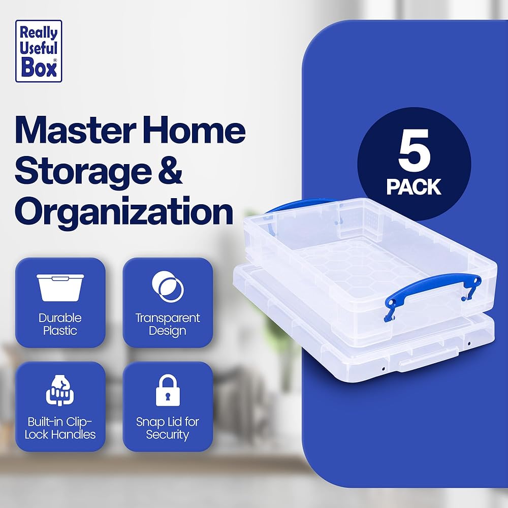 Has your home become a mess with all your valuables in disarray? Keep your home clutter-free with the 5 Really Useful Box Storage Containers that will meet all your organizing needs with utmost convenience. With just a glance, you can effortlessly identify the contents of the storage bin without the need to open it, saving you time and effort thanks to its transparent design. Whether it's sorting through office supplies, decluttering your craft room, or storing miscellaneous household items, these clear storage bins provide a practical solution to keep your space tidy and free of messes. Carrying these plastic storage containers with lids around is a breeze thanks to the built-in clip-lock handles. The snap lid mechanism ensures that the contents remain secure and protected, eliminating any accidental spills or messes. Plus, the durable plastic construction of these stackable storage bins guarantees long-lasting use, even with regular handling and storage. The 4-liter capacity of these totes for storage provides ample storage space for art paper or office supplies without taking up too much room in your home. When your space is filled with clutter, simplify your life with the 5 Really Useful Box 4-Liter Storage Containers, a practical storage solution that combines functionality, durability, and style.