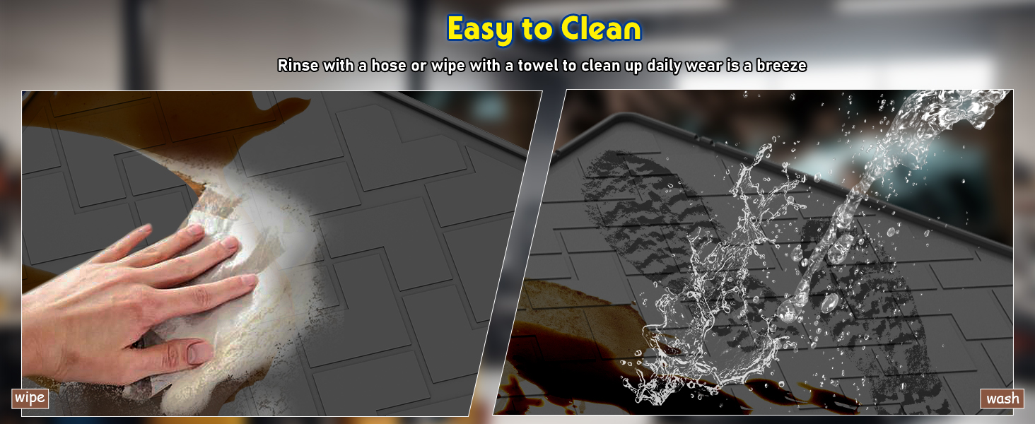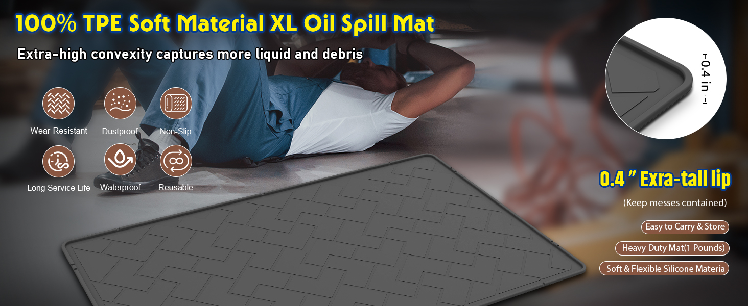• 2 حافة مرتفعة وتصميم أخدود قفل الزيت - لا يوجد اختراق للأرضية، يتميز بحواف مرتفعة وأخاديد عميقة لقفل الزيت تحبس الانسكابات على السطح، مما يمنع الزيت والسوائل من التسرب والتلطيخ أو إتلاف أرضية المرآب الخاص بك.