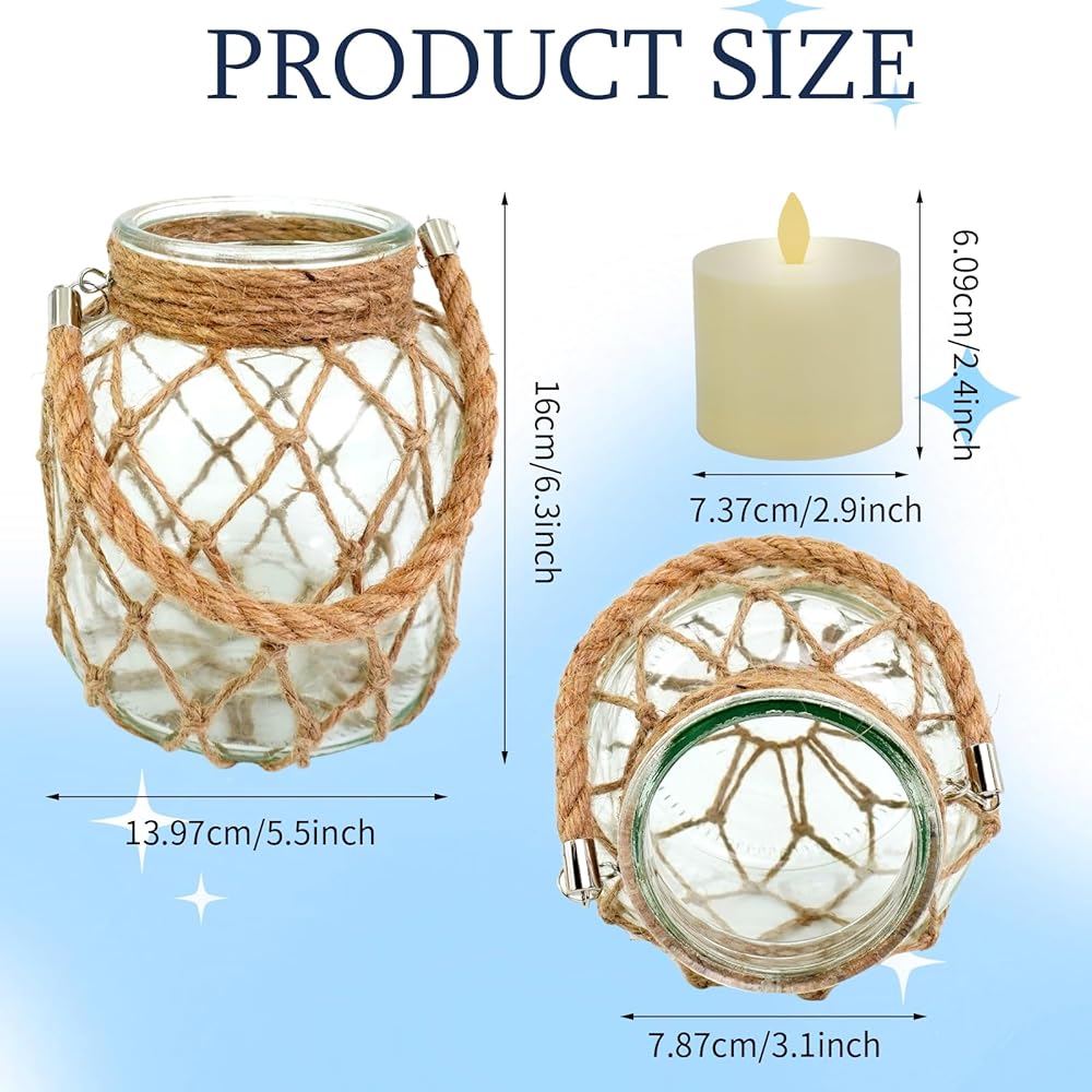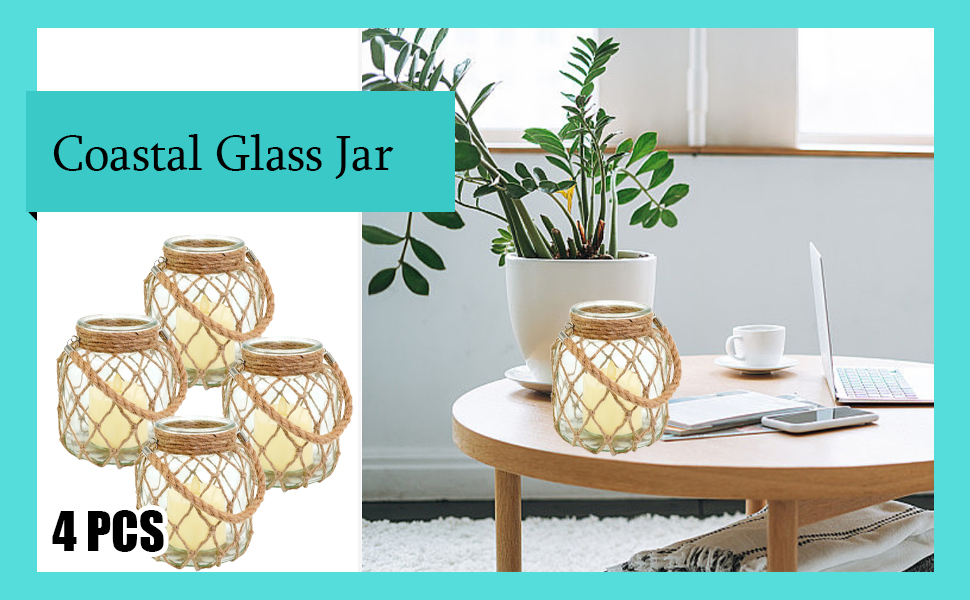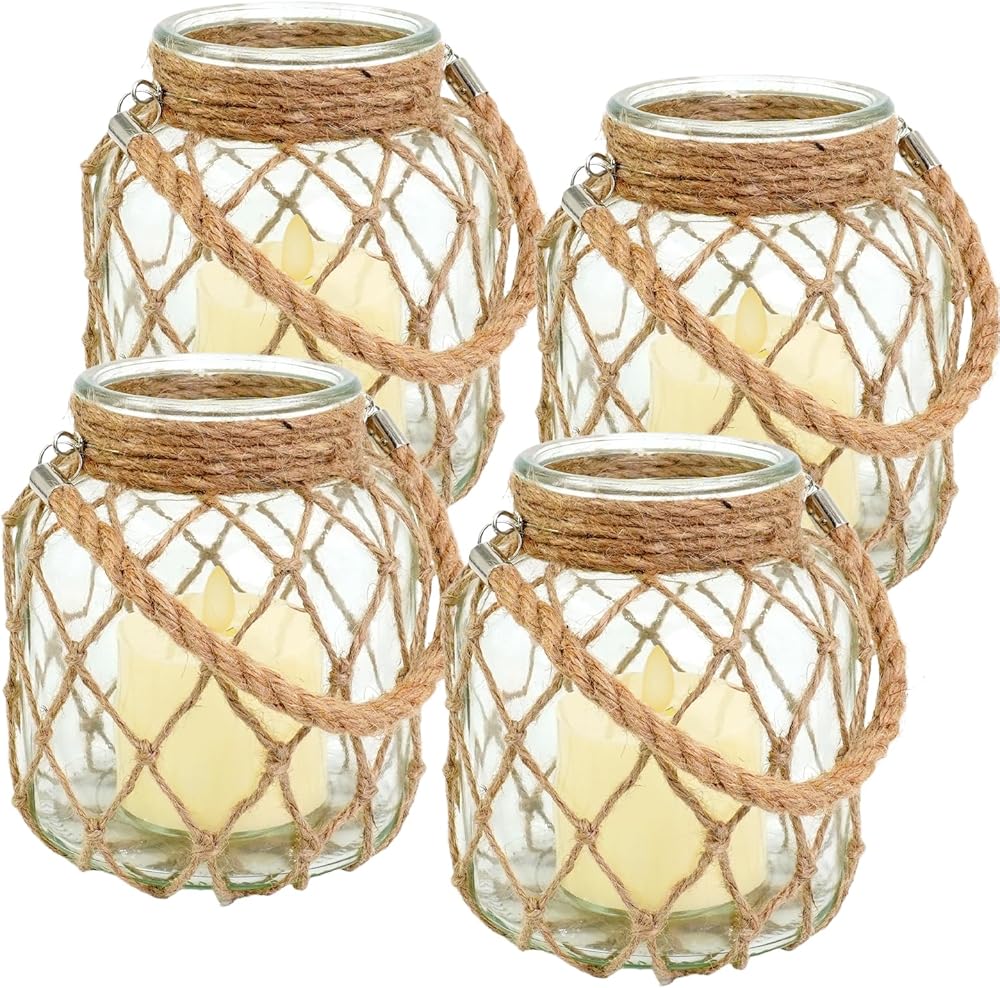 4 مجموعات من فانوس الشموع البحري مقاس 5.5 بوصة × 5.5 بوصة × 6.3 بوصة، برطمان زجاجي ساحلي يعمل ببطارية LED، فانوس عديم اللهب مع مقبض حبل لتزيين قطع مركزية لطاولة الشاطئ والمنزل والشاطئ