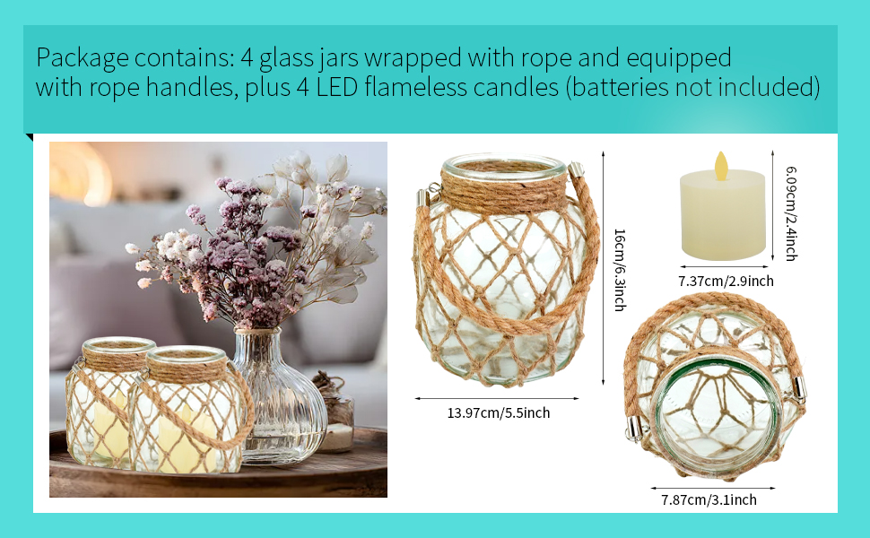 • تشمل العبوة: سوف تحصل على 4 مجموعات فوانيس شموع بحرية بمقابض من الحبال، كل وعاء يصل طوله إلى 6.3 سم تقريبًا، وقطر القاعدة 5.5 سم وفم 3.1 سم؛ يحتوي كل فانوس شمعة بحري على شمعة LED بحجم حوالي 2.9 × 2.4 بوصة ويتطلب 3 بطاريات AAA، وهي غير متضمنة.