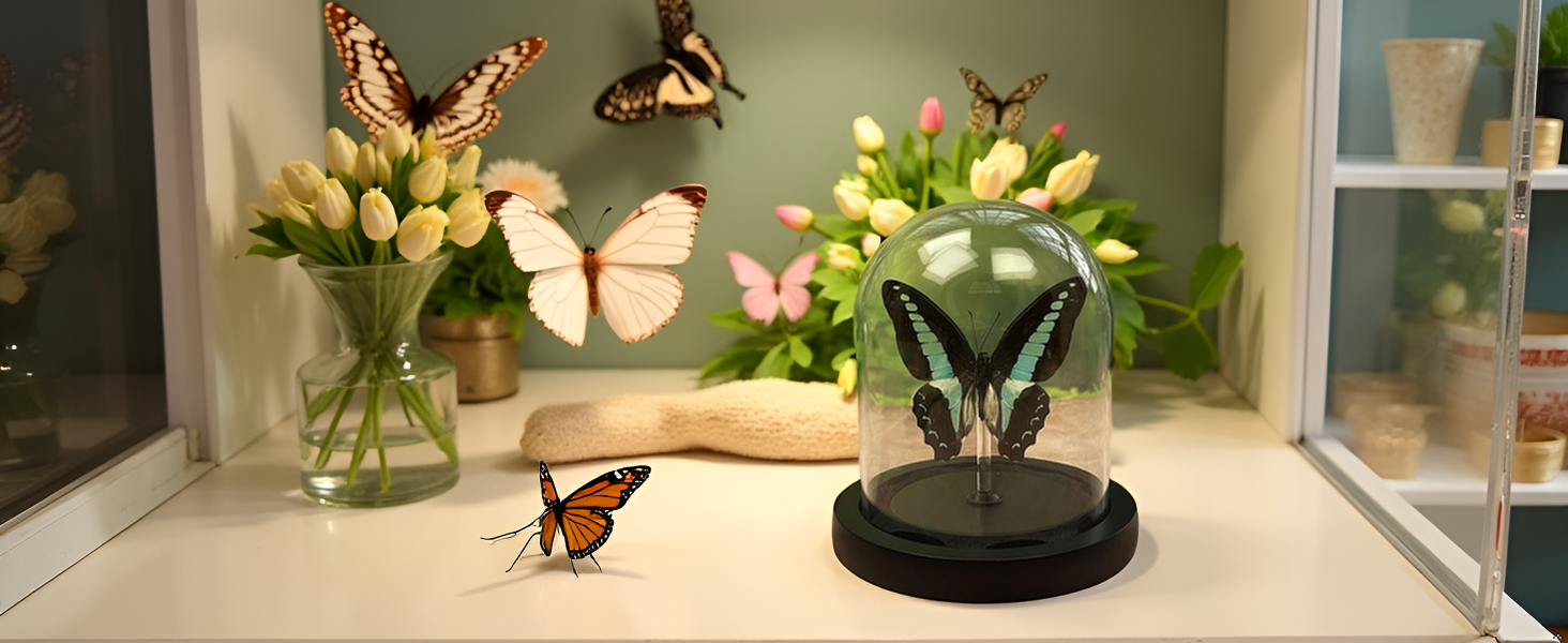 • 【إضاءة LED رومانسية】مضاءة بالدفء، وتضيف لمسة رقيقة ومريحة إلى مساحتك الشخصية، وفراشة التحنيط مثالية لكل من الديكورات اليومية وكذلك ديكور العطلات. نافذة زجاجية عالية الوضوح لا تحافظ فقط على ديكورات المكتب الخاصة بمكتب النساء على شاشة واضحة ولكنها أيضًا خالية من الغبار.