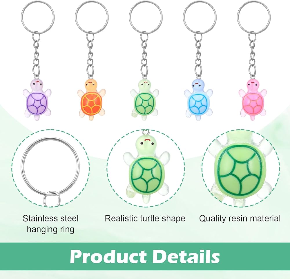 • 【Durable Resin Material】These resin sea turtle keychains are made of quality resin, with smooth surfaces that won't scratch hands or bags. The resin material is resistant to daily wear and fading, ensuring the keychains maintain their color and shape after long-term use. Each keychain is paired with a sturdy metal key ring that won't easily break, securing keys effectively