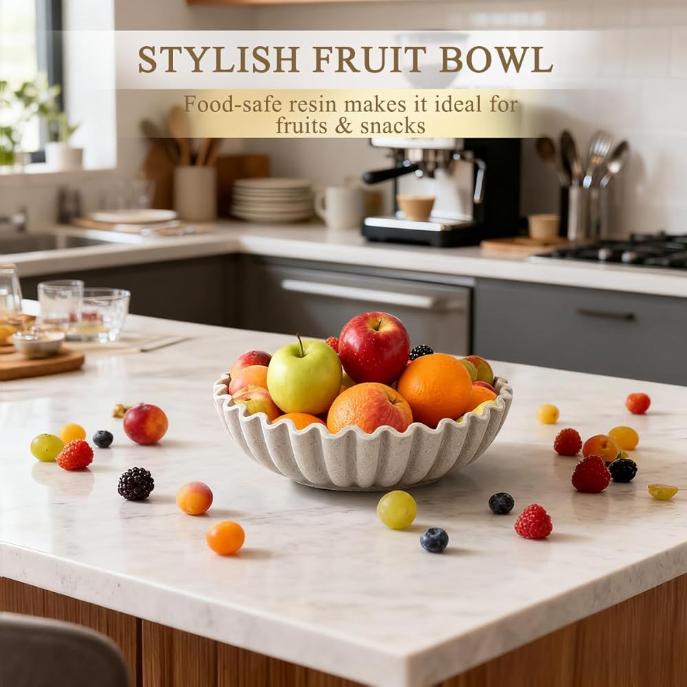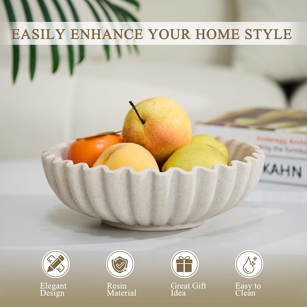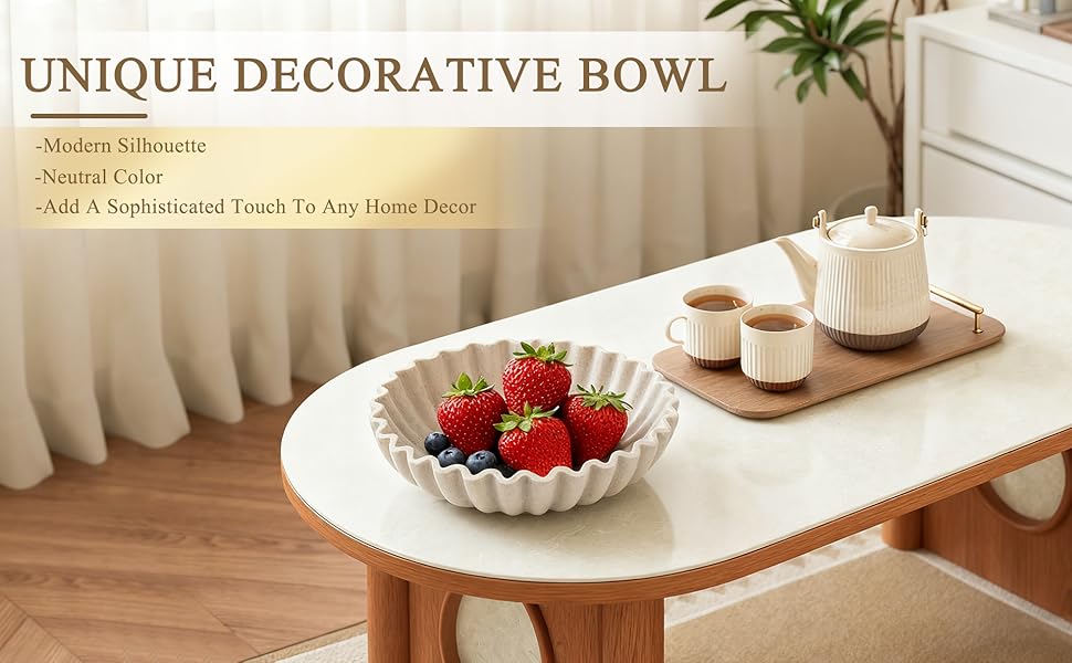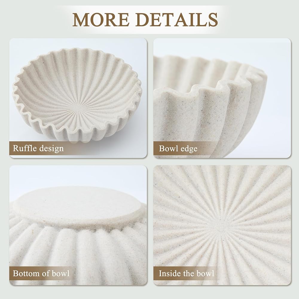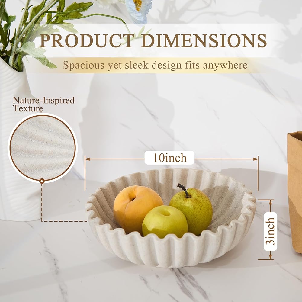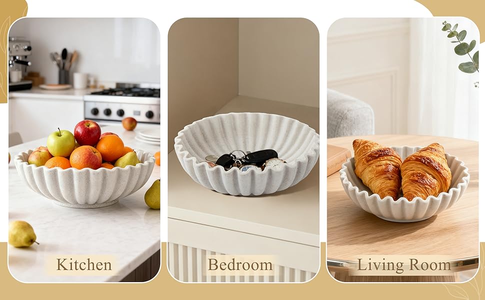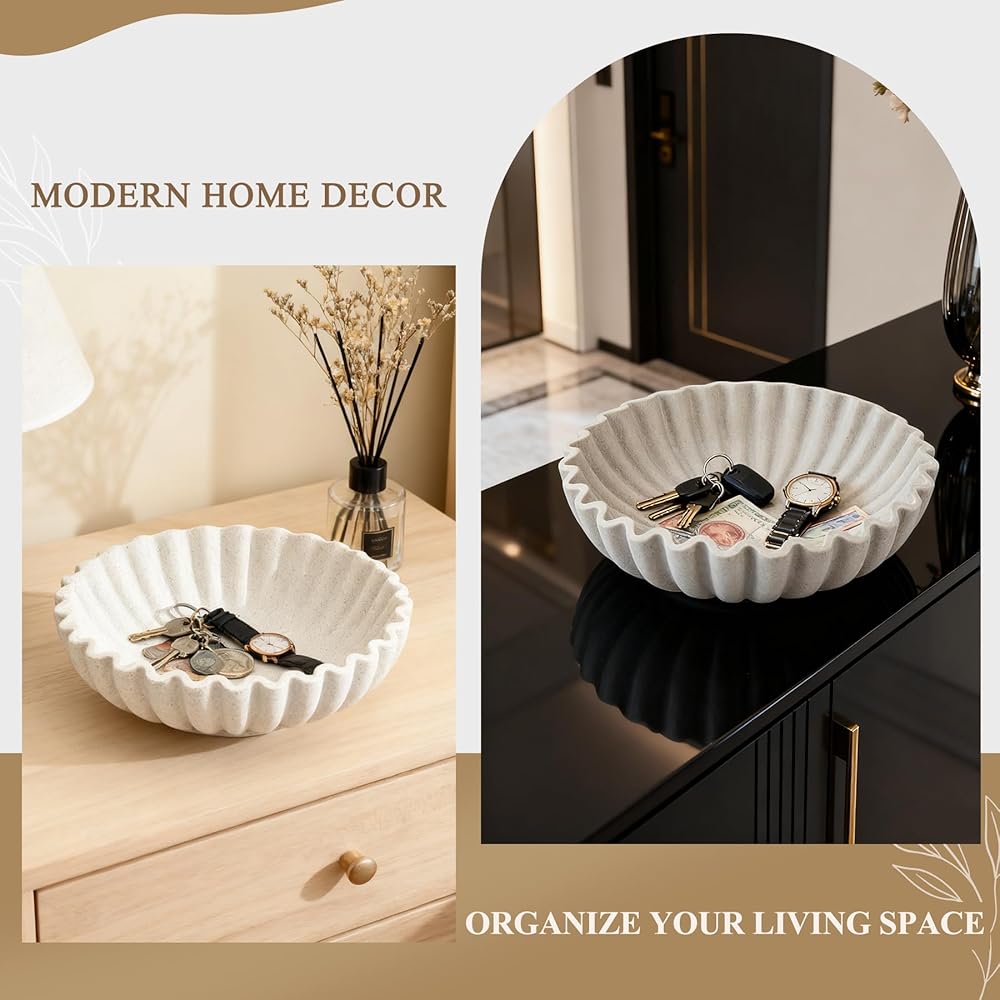 تصميم مكشكش أنيق: يتميز بحافة صدفية متدفقة، يضيف وعاء الديكور هذا أناقة عصرية إلى مساحتك. شكله النحتي بمثابة لمسة لافتة للنظر في المطابخ أو المداخل أو غرف المعيشة، مما يعزز ديكور منزلك دون عناء.