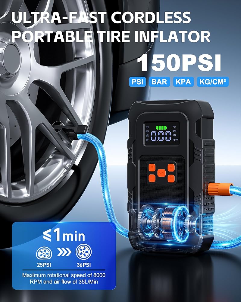 【ضاغط هواء محمول ومنفاخ إطارات】يتميز ضاغط الهواء بقوة 150 رطل لكل بوصة مربعة بأربعة أوضاع محددة مسبقًا (4 وحدات: PSI وKPA وBAR وKG/CM²) لنفخ السيارات والدراجات النارية والدراجات والكرات وحلقات السباحة، وما إلى ذلك. يتوقف تلقائيًا عند القيمة المحددة، مما يلغي الحاجة إلى تعديلات مستمرة. مع تدفق هواء 30 لتر/الدقيقة، فإنه ينفخ إطار قياسي 195/65 R15 من 29 رطل لكل بوصة مربعة إلى 36 رطل لكل بوصة مربعة في دقيقة واحدة تقريبًا. ملاحظة: اترك فترة راحة لمدة 10 دقائق على الأقل بعد 10 دقائق من الاستخدام المتواصل.