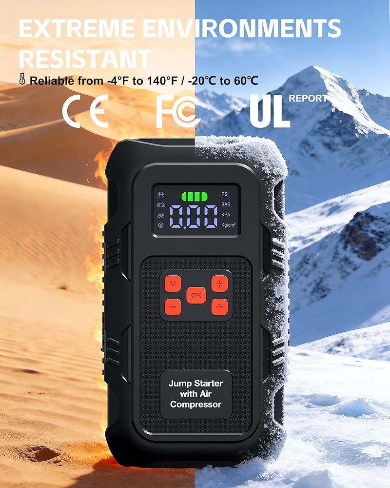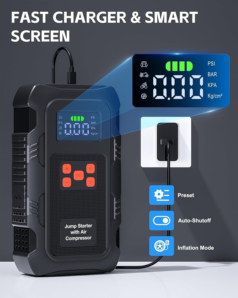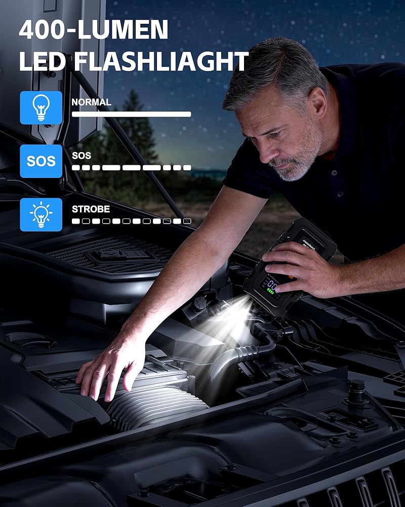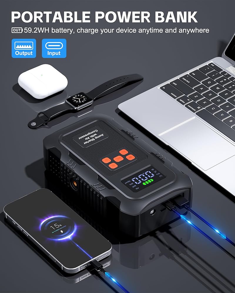 【جهاز تشغيل القفز متعدد الوظائف 8 في 1】صندوق القفز هو جهاز متعدد الاستخدامات يعمل كشاحن محمول لبطارية السيارة، ومنفاخ الإطارات، وبنك الطاقة، ومصباح LED، ومصباح إشارة SOS، ومضخة دراجة، ومضخة كرة، ومقياس الضغط الرقمي. وهو متوافق مع أجهزة USB مثل الهواتف الذكية والأجهزة اللوحية، وهو أداة الاستعداد المثالية لرحلات الطريق والتنقلات اليومية وحالات الطوارئ، مما يضمن عدم انقطاعك أبدًا عن الطاقة أو الضوء.
