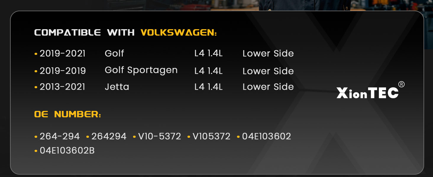 • [النماذج المتوافقة 1]: متوافقة مع فولكس فاجن جولف 2019-2021 L4 1.4L، جولف سبورت واجن 2019 L4 1.4L، جيتا 2013-2021 L4 1.4L.
