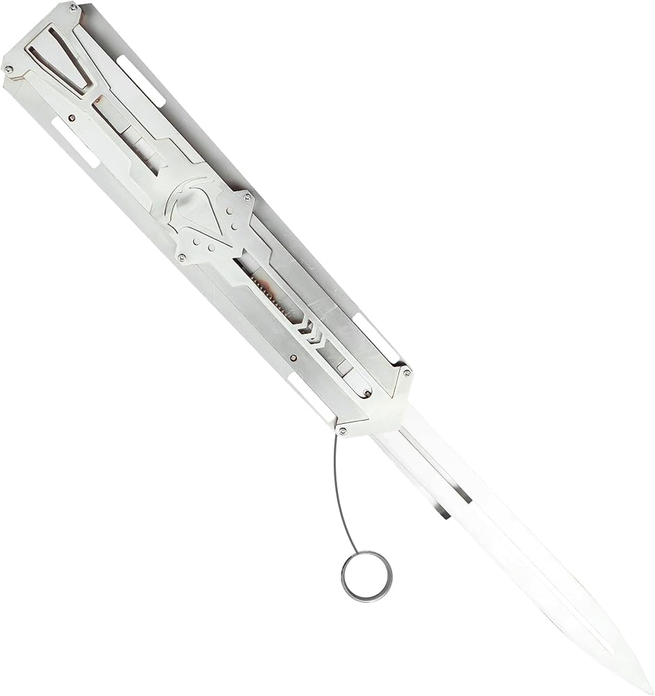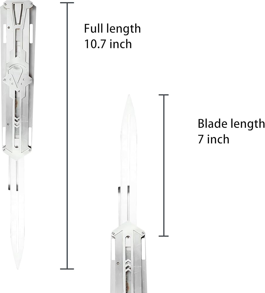 Size: Overall length 26cm, blade extension Total length 42.5cm Weight: Weight: 0.65KG Material: high quality stainless steel Characteristic: Two straight jumps to hide the blade, one hand can control the double switch (stretch to pop up, press the plate to retract). ⚠ Warnings ⚠ This product is not a weapon and has no harmful capabilities. The blade is not sharpened and does not have cutting functionality, ensuring safety during use. It is made from 2mm thick steel or plastic, providing durability and strength, designed specifically for cosplay enthusiasts for role-playing, display, and collection purposes. Please note, this product is intended only for entertainment and display and should not be used in any way that could cause harm.