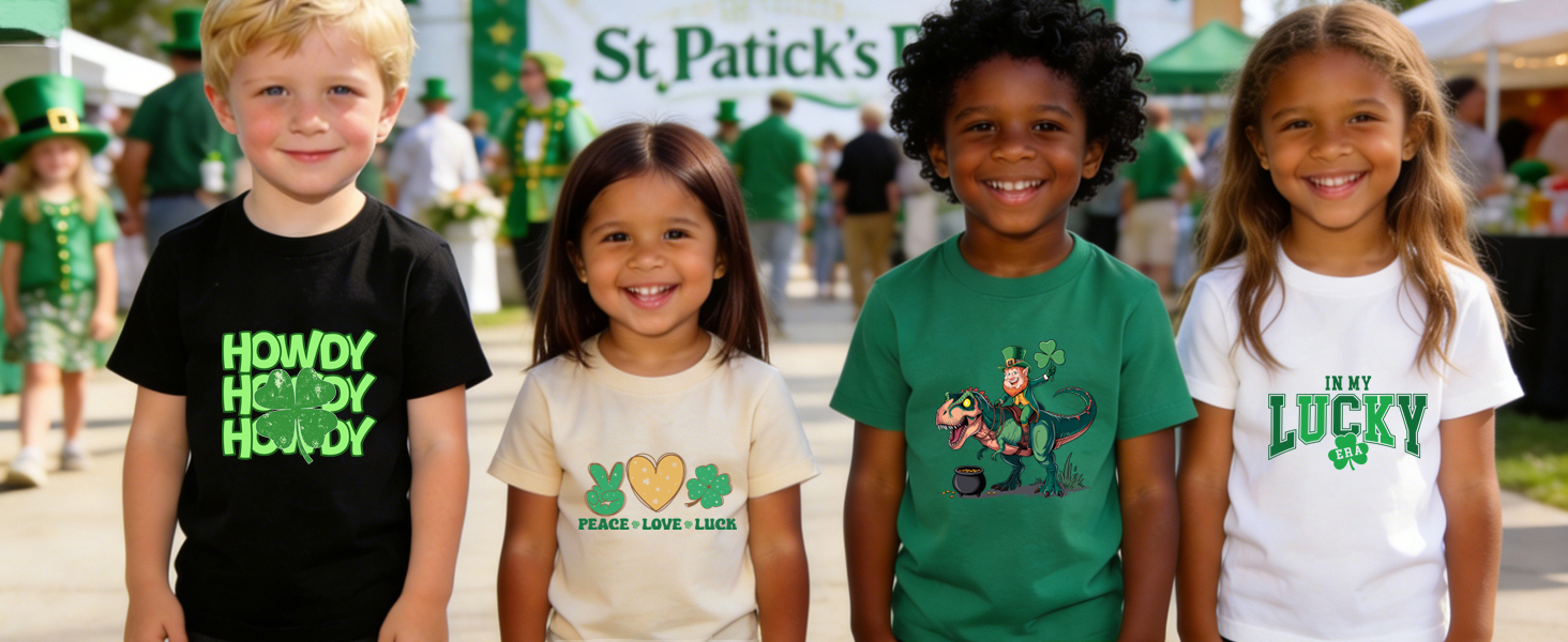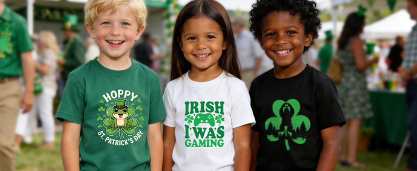 التصميم: قميص عيد القديس باتريك للفتيات مصمم خصيصًا للأولاد والبنات، ويتميز بنباتات النفل والديناصورات وأجهزة الألعاب والشعارات الكلاسيكية. يجمع هذا التي شيرت الخاص بيوم القديس باتريك بين روح احتفالية نابضة بالحياة وعناصر رائعة
