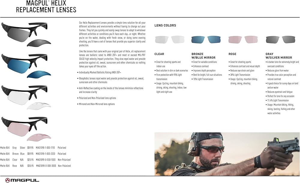 مثل العدسات التي تأتي مع زوجك الأصلي من هيليكس، جميع العدسات البديلة مصنفة باليستية وفقًا لمعيار ANSI Z87+ وتلبي أو تتجاوز الحماية من الصدمات عالية السرعة MIL-PRF 32432