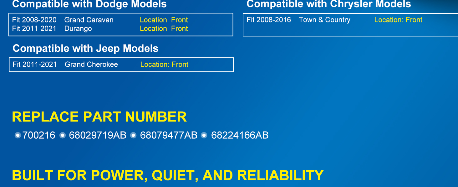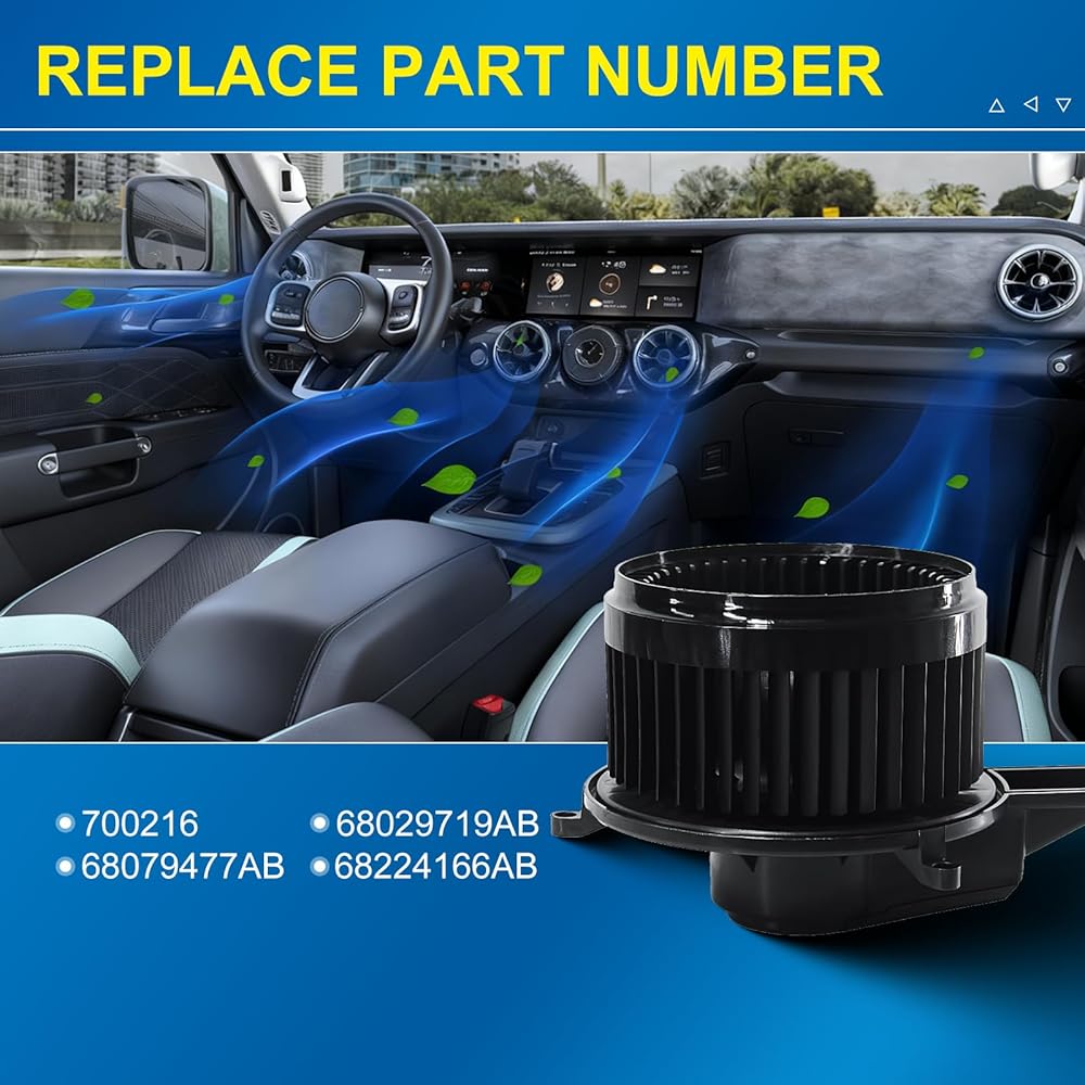 【أرقام استبدال OE】تستبدل أرقام أجزاء OEM 700216، 68029719AB، 68079477AB، 68224166AB. متوافق بنسبة 100% من حيث الملاءمة والأداء ونوع القابس مع محرك منفاخ التيار المتردد في المصنع. تم تصميمه لاستعادة تدفق هواء HVAC الأصلي لسيارتك والأداء الهادئ