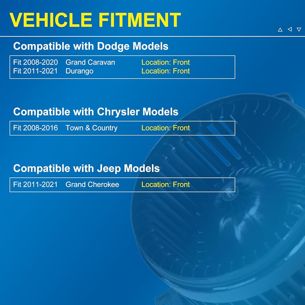 【تركيب السيارة】تم تصميمها كبديل مباشر لمجموعة محرك منفاخ HVAC للعديد من المركبات. يناسب دودج جراند كارافان (2008-2020)، دودج دورانجو (2011-2021)، كرايسلر تاون آند كانتري (2008-2016)، وجيب جراند شيروكي (2011-2021). يرجى التحقق من سنة وموقع سيارتك قبل الطلب