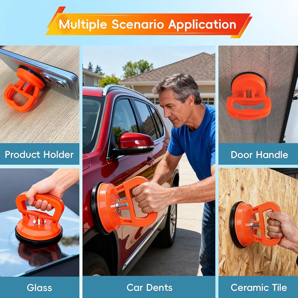 تعدد الاستخدامات: إلى جانب إزالة انبعاجات السيارة، يعمل مزيل انبعاجات السيارة القوي هذا على رفع الأشياء الملساء (الزجاج والفولاذ والأثاث والأبواب والبلاط والمرايا). تتكيف الأحجام الثلاثة مع تحسين المنزل بنفسك، والمهام اليومية، وحتى العمل الاحترافي الخفيف