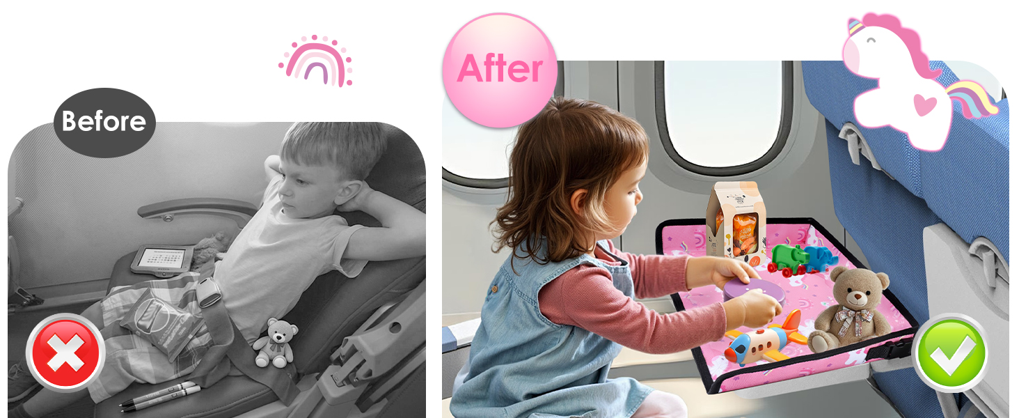 • مثالية للرحلات البرية: لا تقلق بشأن صحة طاولات الصينية أثناء السفر بالطائرة والقطار، فلنستخدم صينية سفر الأطفال، ونضع الرباط القابل للتعديل لجيب الصينية على طاولة الصينية، ثم نضع أغطية صينية الطائرة أعلى الطاولة، وسيحصل الأطفال على صينية نظيفة خاصة بهم! سواء كانوا يتناولون الطعام أو يلعبون بالألعاب، يمكن أن ترافقهم أساسيات السفر بالطائرة.