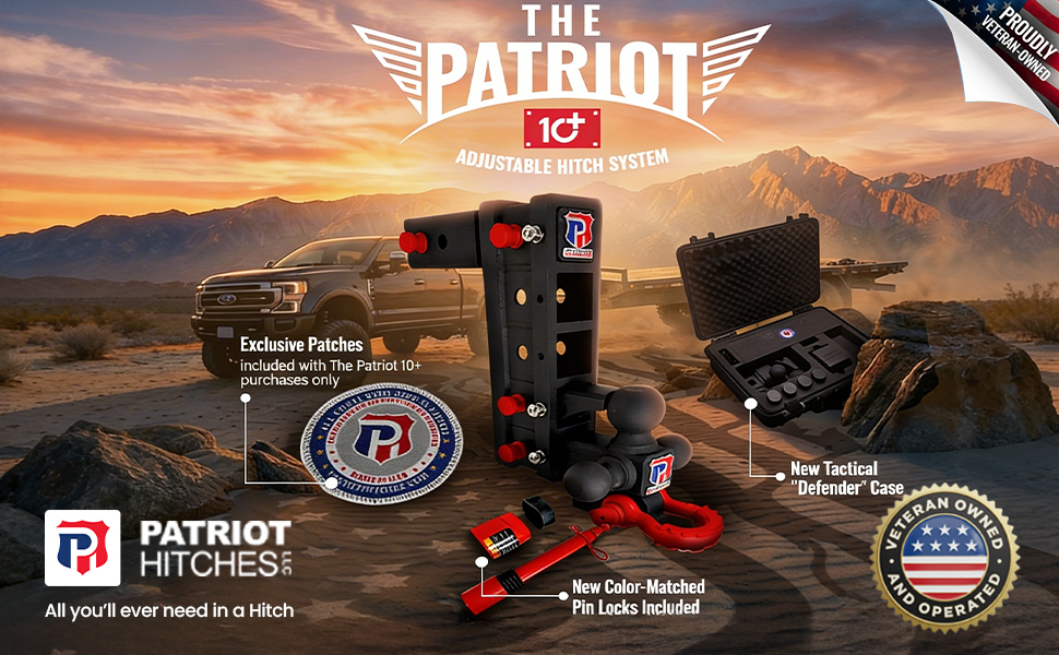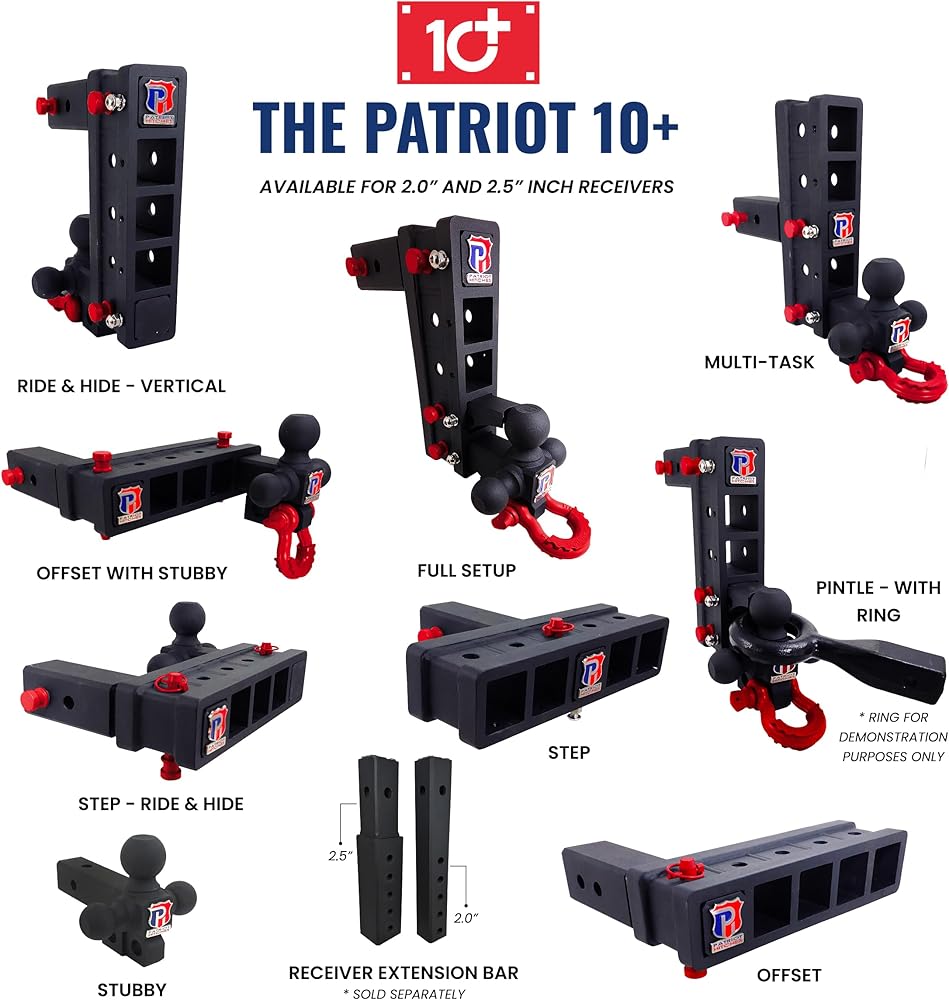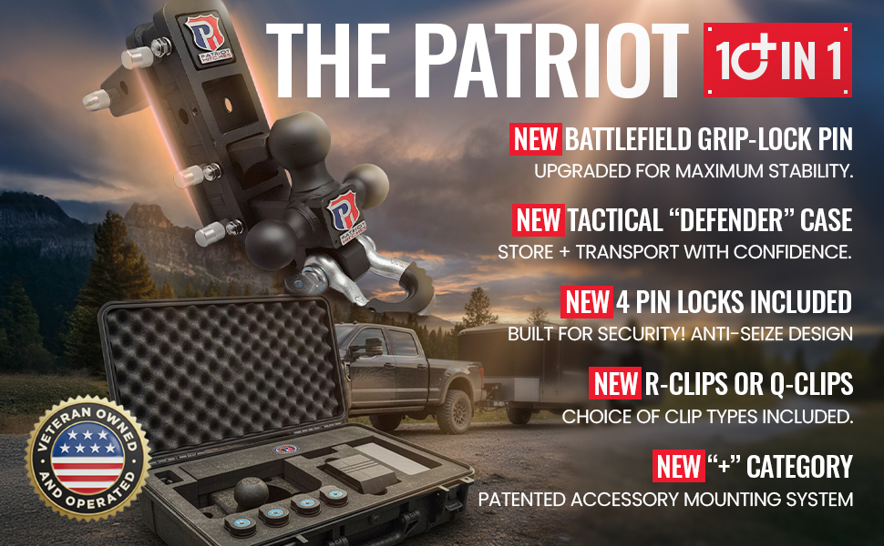 توافق نظام Plus الحاصل على براءة اختراع - يتميز بتصميم فريد ثنائي الفتحة يسمح باستخدام الملحقات في وقت واحد. قم بسحب المقطورة الخاصة بك على جهاز الاستقبال السفلي أثناء استخدام الفتحة العلوية لرفوف الدراجات أو ناقلات البضائع أو ملحقات Patriot Plus المتخصصة.