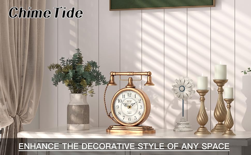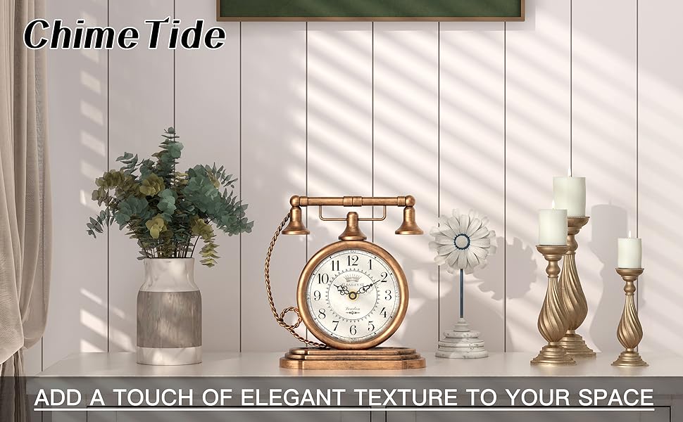 جدد مساحتك - تتميز ساعة الطاولة الكلاسيكية ChimeTide بمظهر ريفي، مع تصميم هاتف غريب الأطوار وملمس مستوحى من الطراز العتيق يضفي طابعًا مميزًا. It perfectly embodies classic vintage aesthetics, making it an ideal choice for living rooms, mantelpieces, offices, bookshelves, desks, farmhouse or rustic-style bedroom bedside tables.