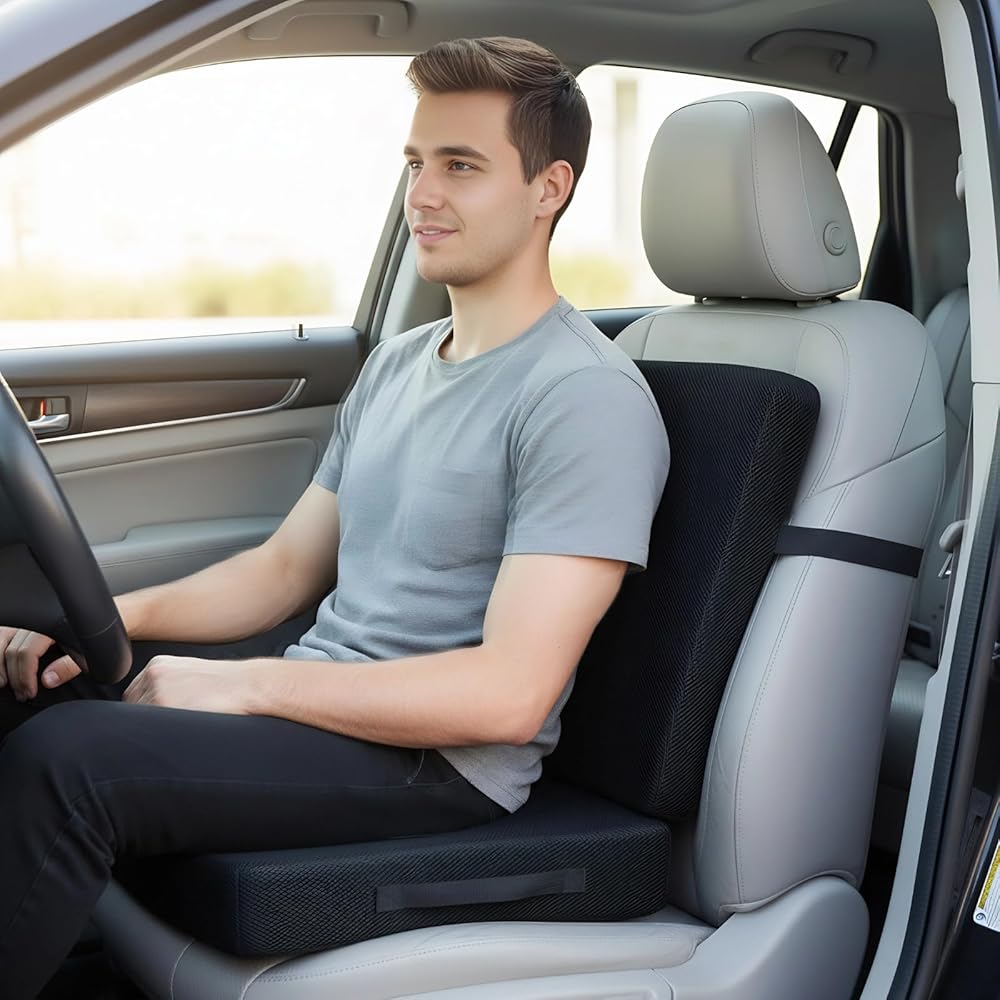 【رؤية محسنة】يمكن أن يؤدي وضع الجلوس المنخفض أثناء القيادة إلى تقييد مجال رؤيتك. تم تصميم وسادة مقعد السيارة للبالغين هذه خصيصًا لأولئك الذين هم أقصر، مما يوسع مجال رؤيتك بشكل فعال حتى تتمكن من رؤية الطريق أمامك بوضوح. اضبط مقعدك على الارتفاع الأمثل، مما يسمح لقدميك بالاسترخاء على الأرض مع جعل فخذيك موازيين للأرض. وهذا يحسن الدورة الدموية ويزيل الخدر والضغط الناتج عن تدلي الساقين
