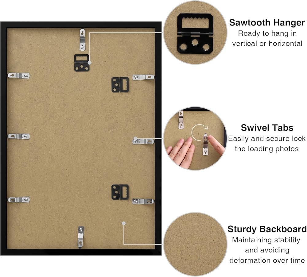 مواد فاخرة: مصنوع من مادة PVC، إطار الصورة مقاس 12x18 يتميز بمتانة خفيفة الوزن. الجزء الأمامي مصنوع من زجاج شبكي، وهي مادة مشهورة بالوضوح والمتانة. الجزء الخلفي معزز بمادة MDF، مما يحافظ على الثبات