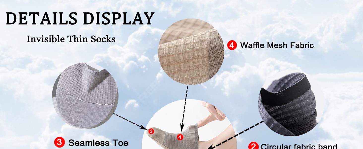 【شبكة رفيعة للغاية قابلة للتنفس】 الجزء العلوي من النايلون الشبكي خفيف الوزن وجيد التهوية يضيف التمدد وتدفق الهواء للمساعدة في الحفاظ على شعور القدمين بالانتعاش والراحة. جواربنا الرفيعة للغاية التي لا تظهر تبدو خفيفة بدون حجم إضافي.