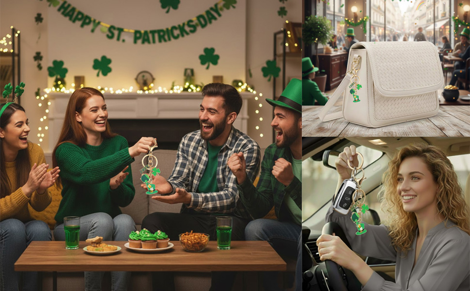 • إكسسوارات سلسلة مفاتيح عيد القديس باتريك: تتميز برموز مميزة - نبات النفل ثلاثي الأوراق، ووعاء من الذهب، وقبعة الجني. إنه الإكسسوار المثالي لإظهار فخرك الأيرلندي وإضفاء لمسة من الحظ أينما ذهبت.