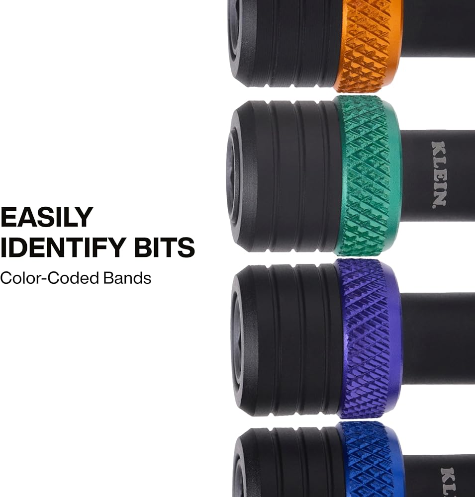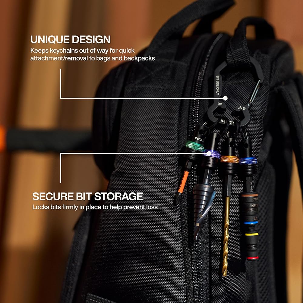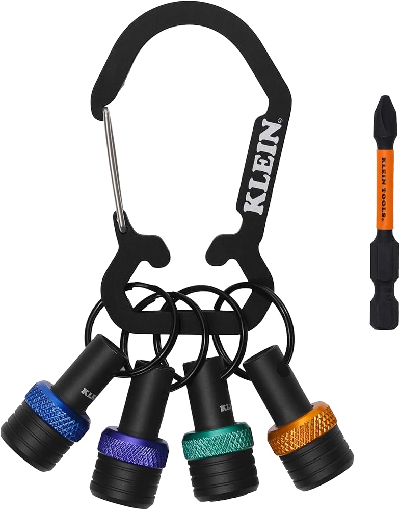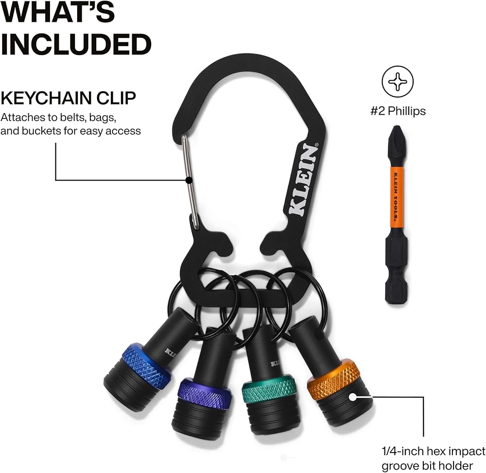 Klein Tools Bit Holder Keychain Set keeps 1/4-Inch hex bits securely stored and easily accessible. Each bit holder features colored bands for fast identification, and the durable keychain clips easily to belts, tool pouches, and bags. Individual holders keep bits separated for fast selection and increased efficiency on the job. For more than 160 years, Klein Tools has manufactured premium-quality, professional-grade hand tools that deliver the performance, durability and precision needed to get the job done right. Our family of engineers, workers and craftsman continue to put six generations of expertise into every tool we create by using only the highest quality materials, superior workmanship, and keeping manufacturing as close to home as we can. Klein isn't just the name of our company, it's also our family name. And since we're an American company that's family-owned and family-run, you know you can count on us to be here tomorrow. Klein Tools doesn't just make great products, we make great products that stand up to the demands of the professionals who use them every day ... Since 1857.