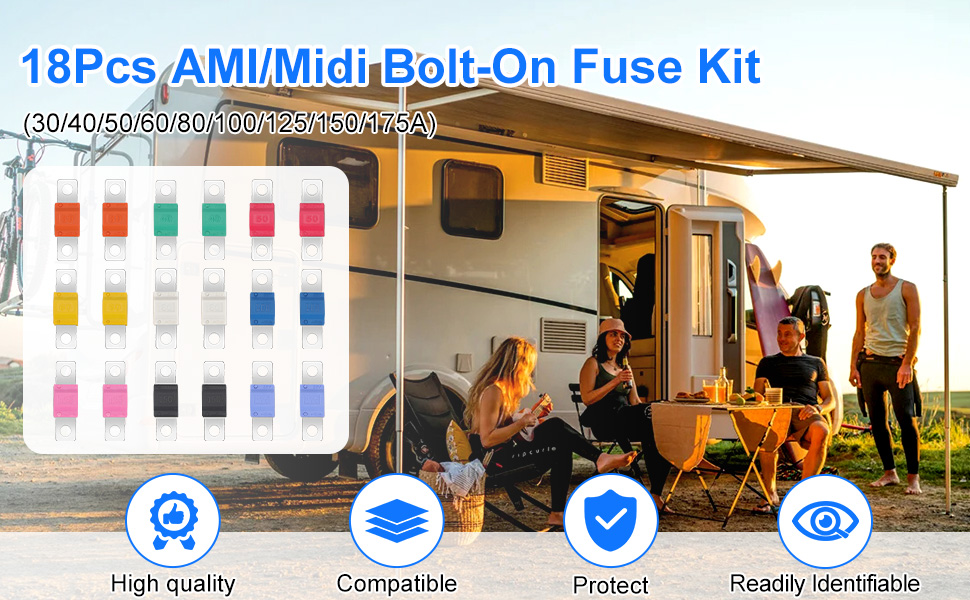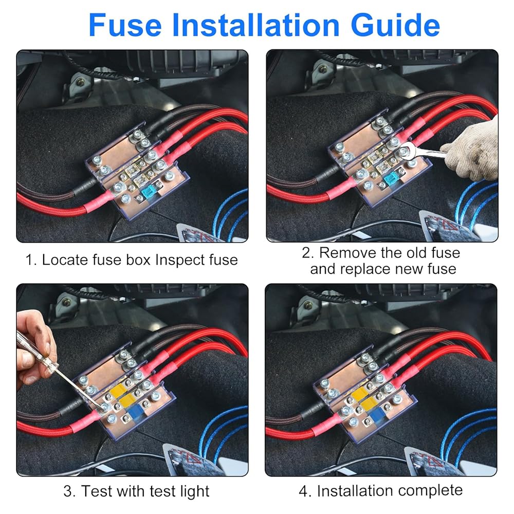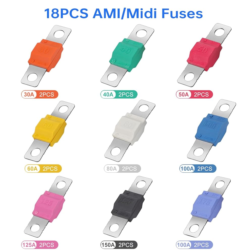 مجموعة الصمامات: تتضمن 18 قطعة من صمامات AMI/Midi (2 قطعة لكل منها 30/40/50/60/80/100/125/150/175A) مما يوفر مجموعة واسعة من الخيارات لتلبية الاحتياجات الكهربائية المختلفة