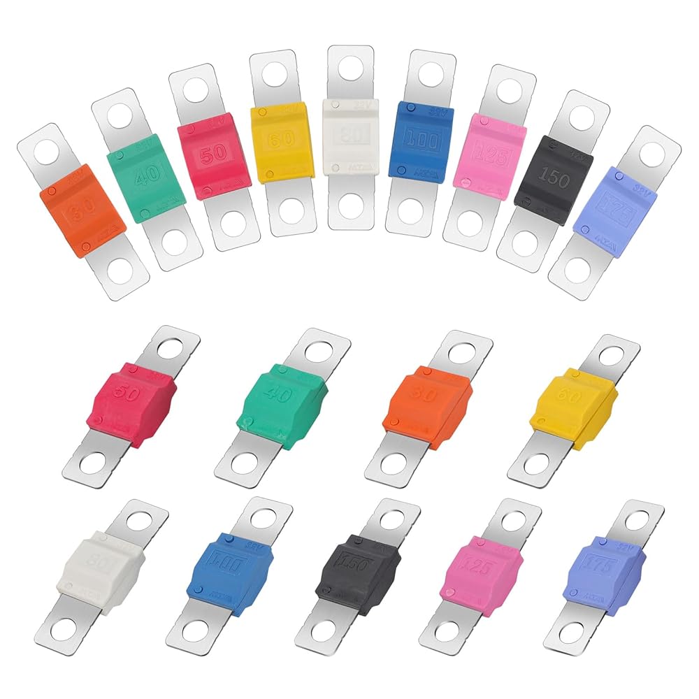 مجموعة متنوعة من الصمامات AMI/Midi 18 قطعة من TSV، 12 فولت - 58 فولت صمامات عالية التيار مطلية بالنحاس لسيارة شاحنة قارب، 30A، 40A، 50A، 60A، 80A، 100A، 125A، 150A، 175A