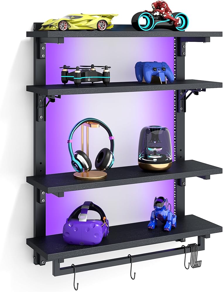أرفف عائمة للألعاب قابلة للطي مقاس 24 بوصة مع مصابيح LED، ورف عرض من 4 طبقات مع رف قابل للتعديل، ورف مثبت على الحائط مع قضيب تعليق و8 خطافات على شكل حرف S لغرفة الألعاب، باللون الأسود