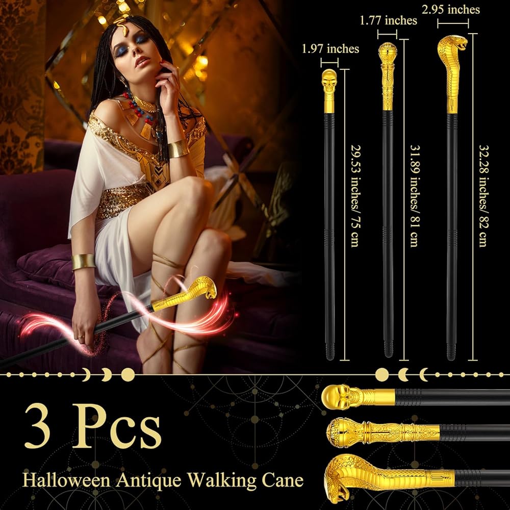 3 عصي دعامة واقعية: مجموعة طاقم الكوبرا المصرية تأتي مع 3 أنماط مختلفة من عصي الدعامة التي تضيف أصالة إلى زيك؛ تم تصميم كل واحدة بشكل معقد لتشبه عصا عتيقة، مما سيضفي طبقة إضافية من الغموض والإثارة على ملابس الهالوين الخاصة بك