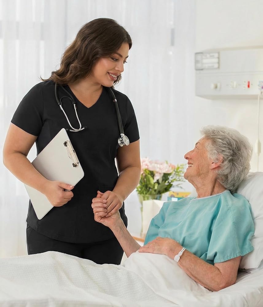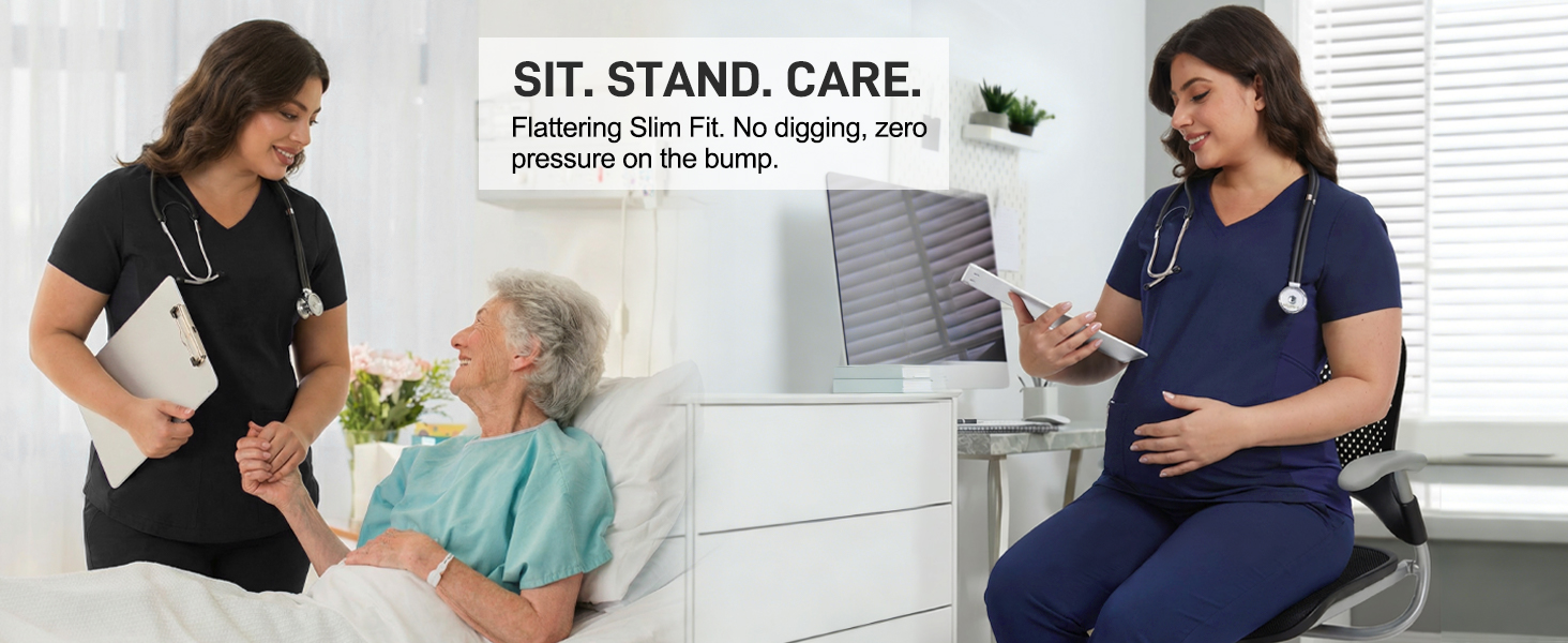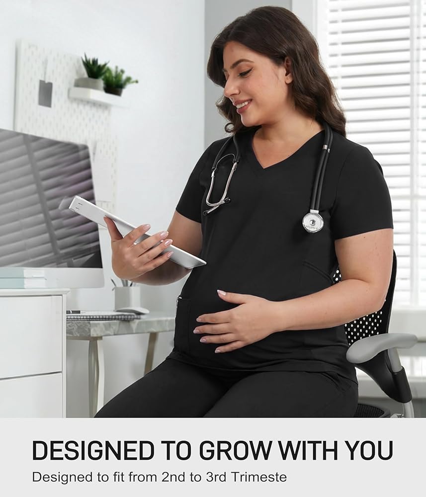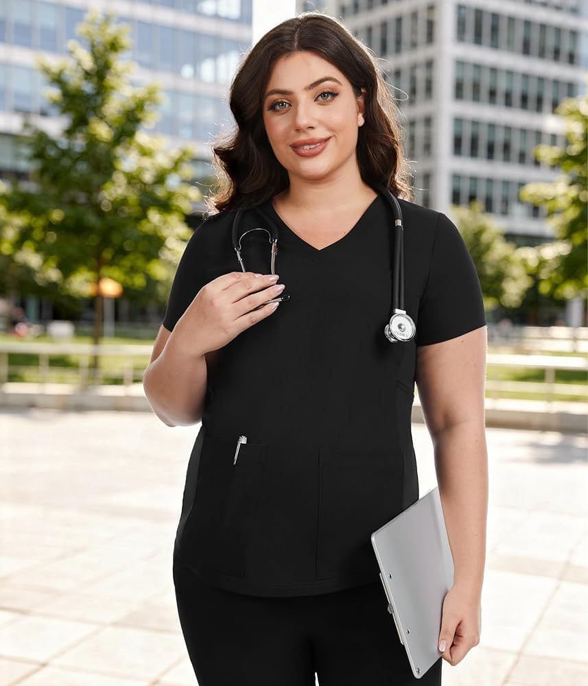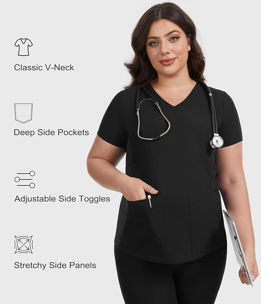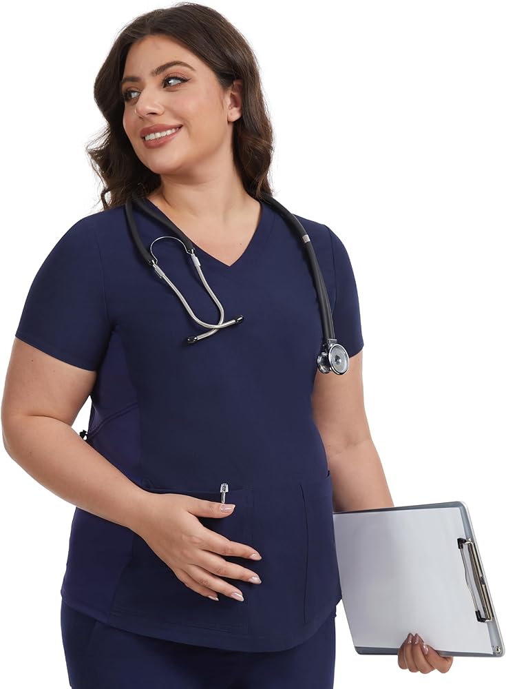 رقبة على شكل حرف V جذابة واحترافية - تتميز بخط رقبة على شكل حرف V نظيف ومعتدل يلبي معايير ملابس الرعاية الصحية بينما يؤطر الرقبة بشكل أنيق. هذا التصميم يبقيك بمظهر مصقول وواثق في العمل