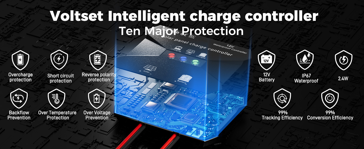 نظام حماية السلامة الشامل: حماية متعددة بما في ذلك الجهد المنخفض، والجهد الزائد، والحمل الزائد، والدائرة القصيرة، وحماية الشحن الزائد، والاتصال المضاد للعكس من الألواح الشمسية. يعمل منظم الطاقة الشمسية هذا على إطالة عمر البطارية مع حماية القطبية العكسية.