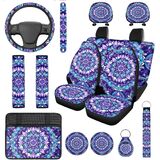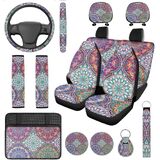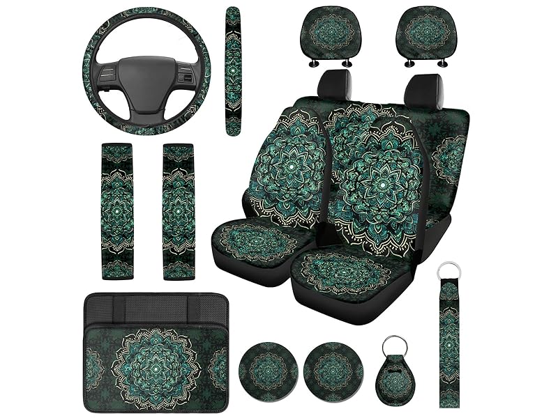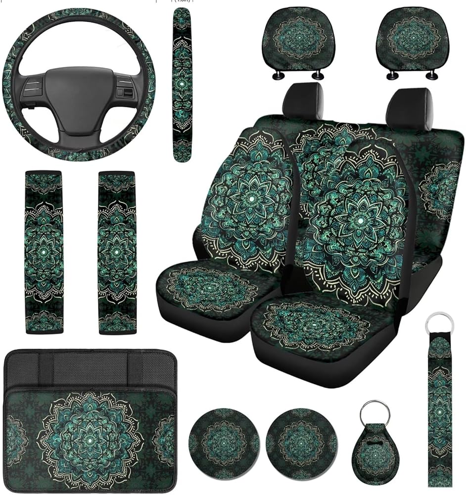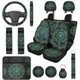14 قطعة من أغطية مقاعد السيارة ماندالا الخضراء مع غطاء عجلة القيادة، أغطية حزام الأمان وحامل الأكواب مع سلسلة مفاتيح، مجموعة حماية السيارات المبتكرة غير شاملة للسيارات ذات الدفع الرباعي التركية، أخضر