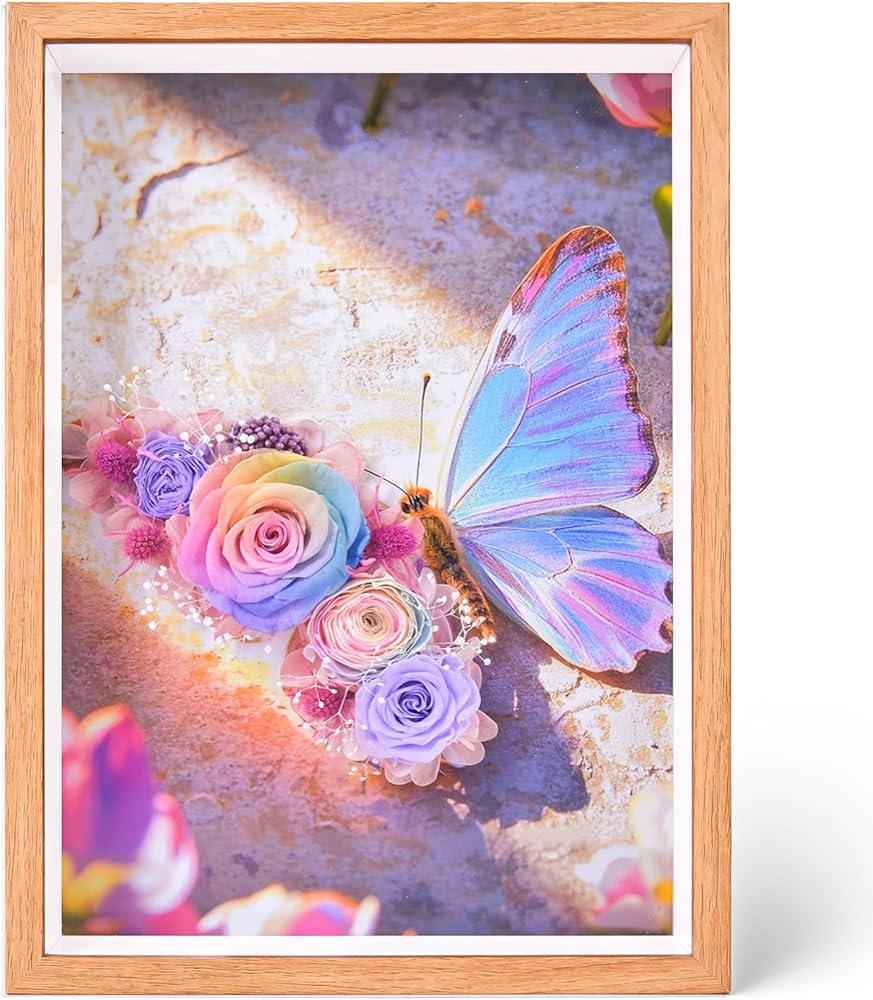 Transform any space into an enchanting gallery with this stunning preserved flower butterfly art frame. Each piece features a dramatic butterfly silhouette adorned with meticulously preserved roses in rich hues of blue, purple, or pastel shades, creating a captivating 3D effect. The artful arrangement combines the delicate beauty of real preserved flowers with elegant butterfly imagery, all protected within a sophisticated shadow box frame. Perfect as a statement piece in living rooms, bedrooms, or office spaces, this unique wall art maintains its vibrant appearance for over 3 years without maintenance. The thoughtfully designed composition makes it an ideal gift for special occasions like anniversaries, birthdays, or housewarming celebrations. Each frame serves as a lasting alternative to traditional fresh flower arrangements, bringing perpetual beauty and artistic charm to any interior setting. The harmonious blend of florals and butterfly motifs creates a mesmerizing focal point that elevates any wall decor collection.