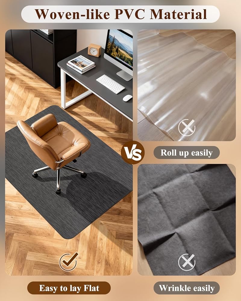 متينة ومقاومة للتشقق: سجادة الكرسي المكتبي هذه مصنوعة من بولي كلوريد الفينيل عالي الجودة والمطاط بسمك 0.08 بوصة. لقد خضع لأكثر من 18000 اختبار متانة، مما يضمن متانة استثنائية. حتى مع الاستخدام طويل الأمد، لا داعي للقلق بشأن التشقق أو التقشير.