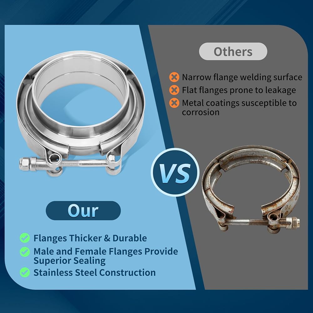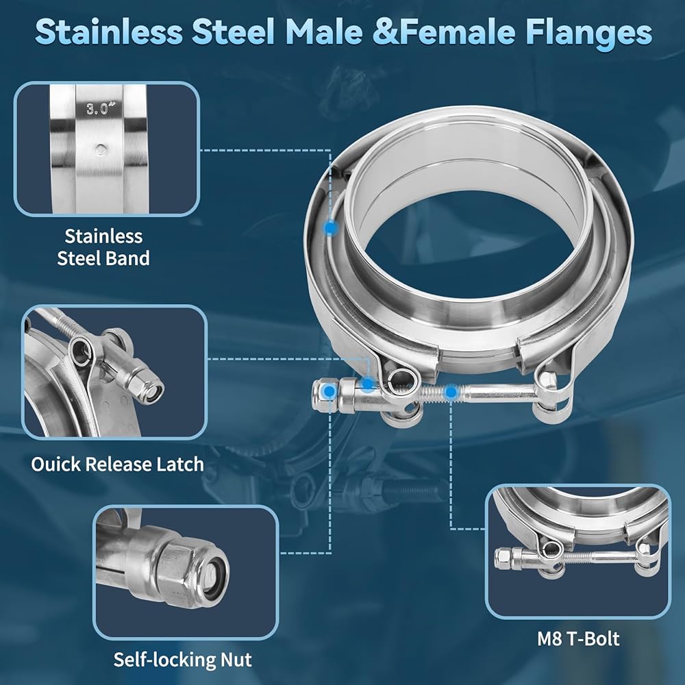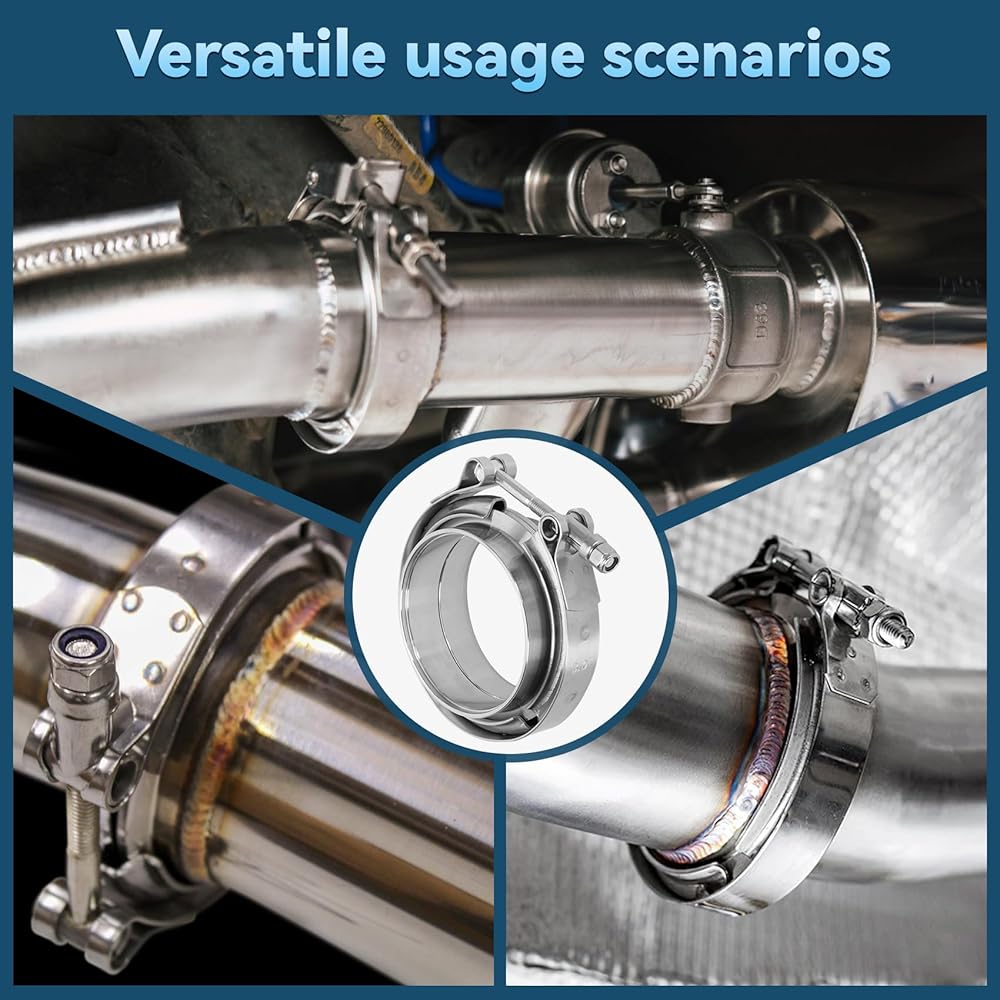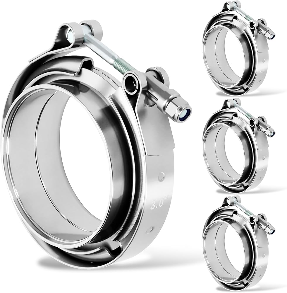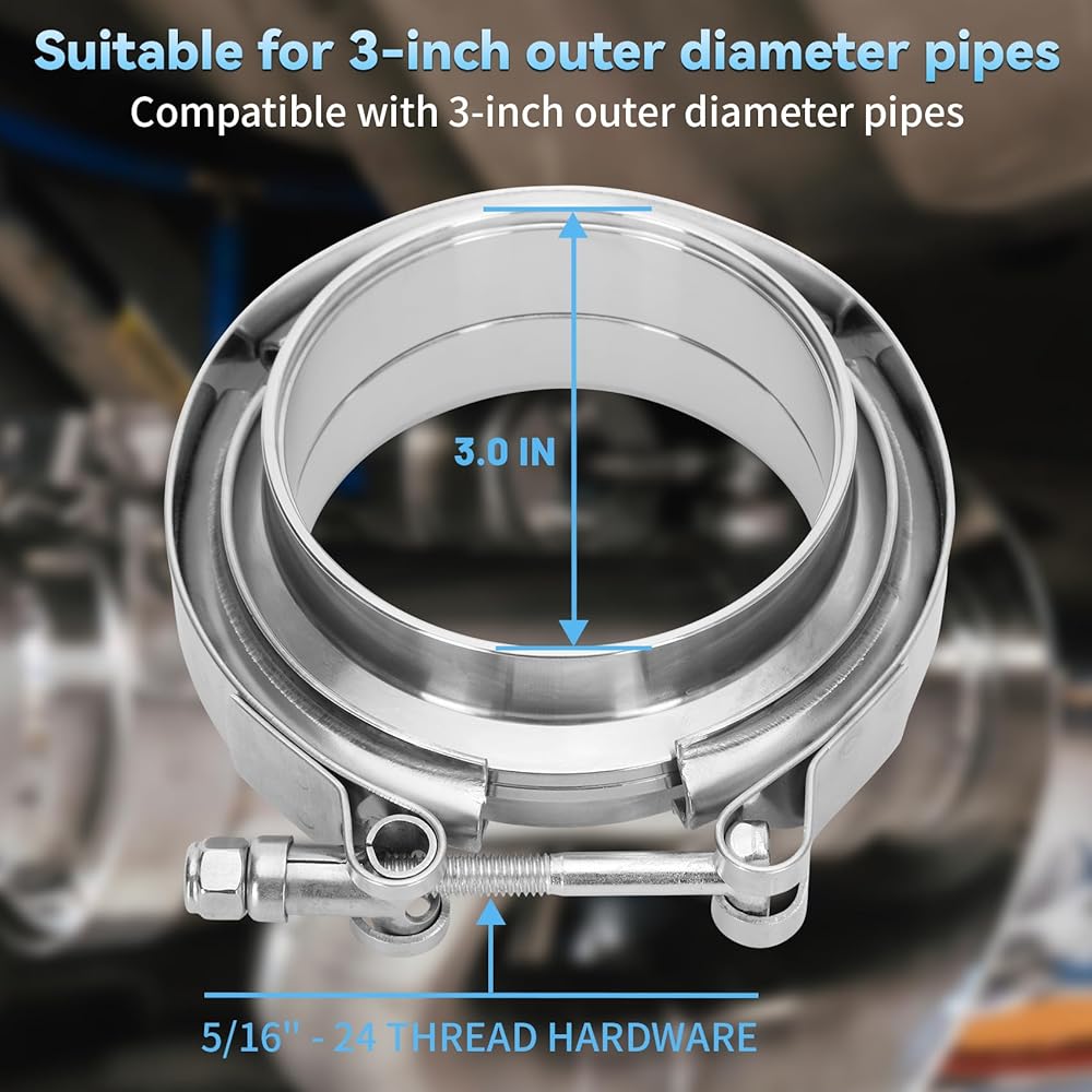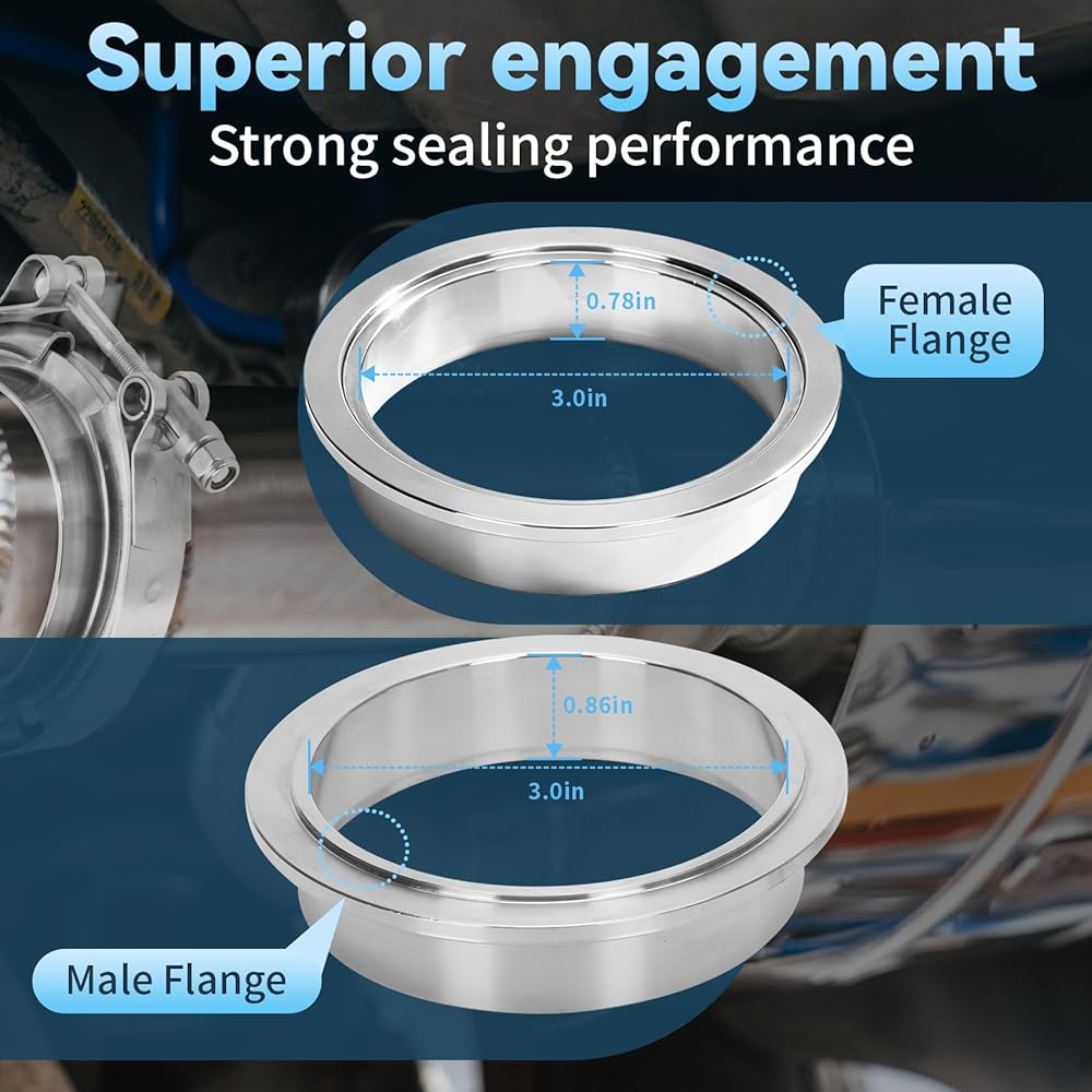 【Broad Vehicle Compatibility】3 inch v band clamp with flange Engineered for universal fit on 3.0" OD piping. Perfect for performance exhaust systems, downpipes, turbo setups, and cat-back systems on a wide range of turbocharged and high-horsepower vehicles
