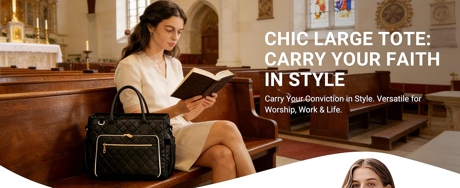 حقيبة حمل واسعة الكل في واحد: بأبعاد كبيرة (13.4 بوصة × 10.6 بوصة × 5.3 بوصة)، تحمل هذه الحقيبة بسهولة الكتاب المقدس الكبير الخاص بك، والكمبيوتر المحمول مقاس 14 بوصة، والآيباد مقاس 12.9 بوصة، والضروريات اليومية. يمكن استخدامها بشكل مثالي كحقيبة كنيسة، أو حقيبة عمل، أو حقيبة سفر، أو حقيبة كمبيوتر محمول - وهي حقيبة متعددة الاستخدامات للنساء حقًا.