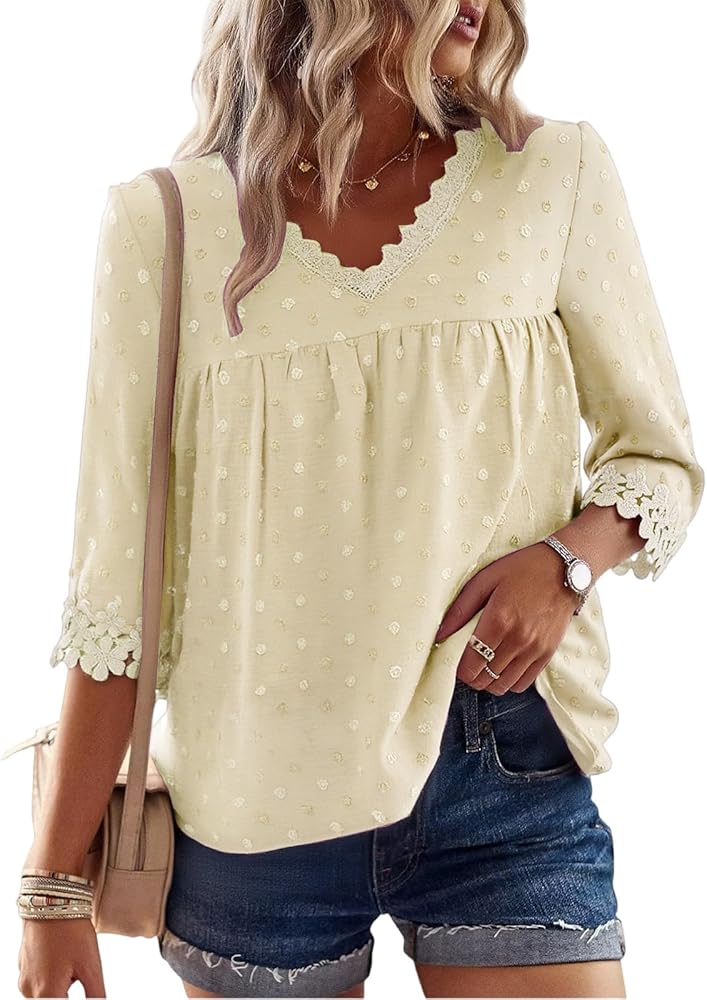 【نسيج أنيق وراحة مسامية】مصنوعة من الشيفون الخفيف الوزن والمتدفق مع ملمس منقط سويسري رقيق، هذه البلوزة ناعمة بشكل فاخر وقابلة للتنفس على الجلد. تُبرز زخرفة الدانتيل الأنيقة خط العنق والأصفاد بشكل أنيق، مما يضيف لمسة من التفاصيل الدقيقة. مصمم للارتداء طوال اليوم، فهو التوازن المثالي بين الرقي والراحة، مما يجعله خيارًا مثاليًا للطقس الدافئ ونزهات الصيف.