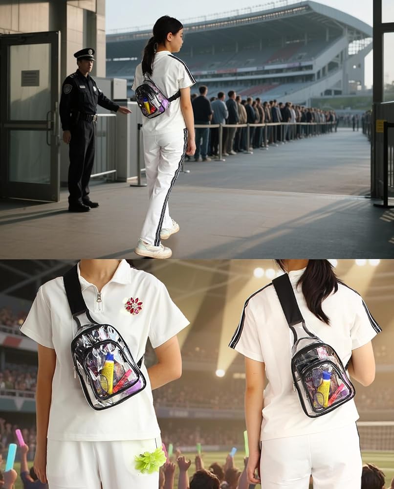 • 1. Event-Ready Compact Size:​​ Measures 27x18x9 cm / 10.5x7x3.5 in, perfect ​clear sling bags for large gathering events, concerts. Easily fits a phone, wallet, keys, makeup, cash, cards, and tickets.