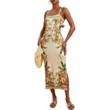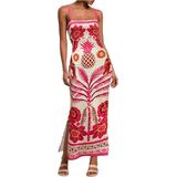 - المزايا: بدون أكمام، مقصوص، رباط خلفي، طباعة استوائية، حاشية مقسمة، فستان طويل