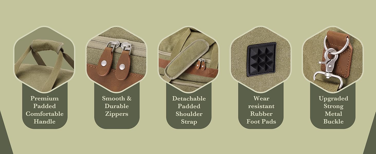 تصميم مفصل: حقيبة الدفل للرجال مجهزة بوسادة حمل مريحة وحزام كتف قابل للتعديل مع وسادة كتف، مما يعزز بشكل فعال راحة رحلتك. وفي الوقت نفسه، يتم تعزيز طبقات حزام حقيبة اليد الرجالية، ويتم إضافة الجزء السفلي من الحقيبة القماشية بلوحة قاعدة معززة، مما يجعل الحقيبة أكثر متانة وثلاثية الأبعاد!