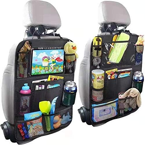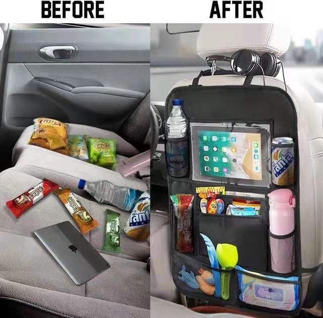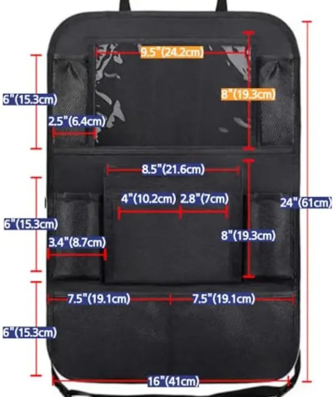 Multi Storage Pockets : Our seat back car organizer comes with 9 storage compartments of different sizes, including a clear tablet holder, bottle pockets, and large mesh pockets for other essentials.