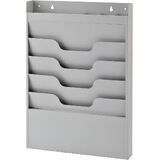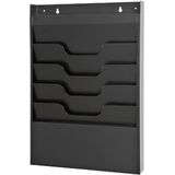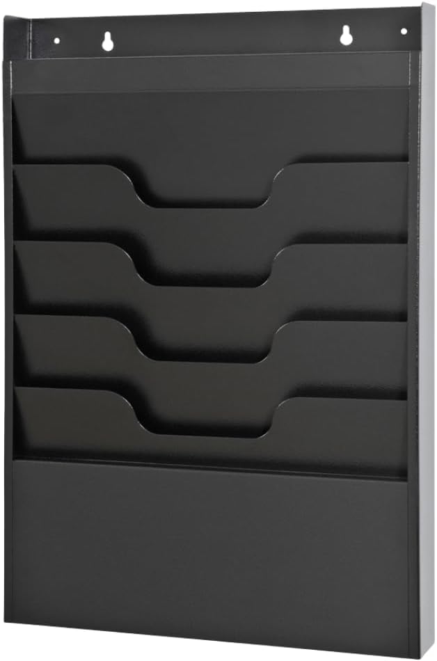 Designed to save desk space, this wall-mounted file holder keeps essential papers within arm's reach while maintaining a clutter-free environment. The divided top section provides dedicated storage for office supplies such as staplers, paper clips, and pens.