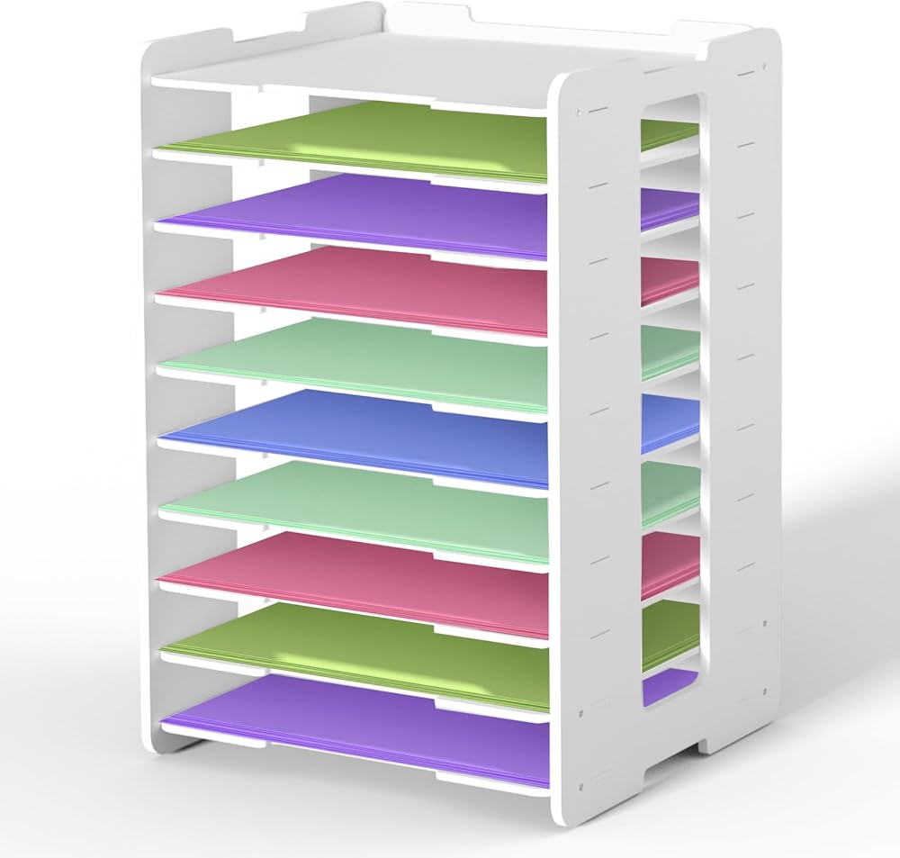 منظم الورق: يبلغ حجم وحدة تخزين منظم الورق المجمعة مقاس 12 × 12 12.6 طولًا × 12.6 عرضًا × 12.6 ارتفاعًا، وتتميز بـ 6 مساحات كبيرة جدًا، ارتفاع كل منها 5.08 سم، ومصممة لتناسب ورق مقاس 12 × 12 بوصة. مثالية لتنظيم الغرف الحرفية، ويمكن وضعها على الرفوف أو المكاتب أو وحدات التخزين. رائع للمكاتب المنزلية والمدارس والاستوديوهات الفنية، يوفر هذا المنظم مساحة تخزين متعددة الاستخدامات لمختلف المنتجات الورقية، مما يحافظ على المساحة الخاصة بك مرتبة وفعالة