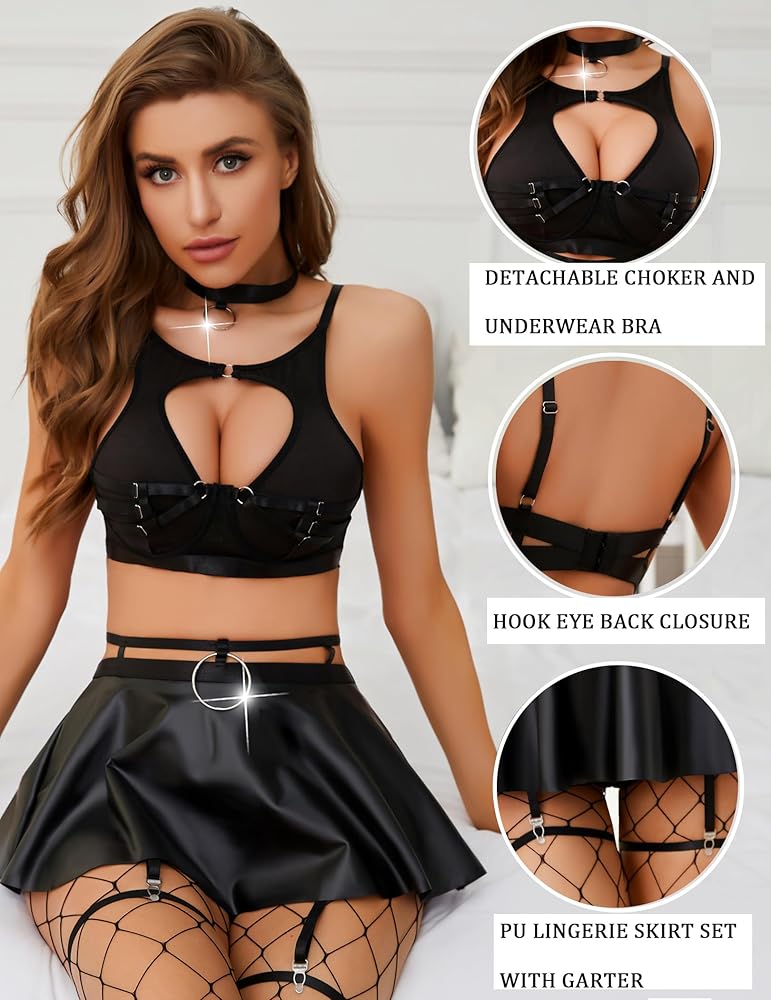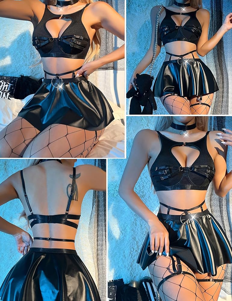 【محتوى العبوة】زي متعدد القطع من الجلد الصناعي / قميص مثير، صدرية، شبكة صيد السمك، الأربطة ومجموعة قلادة