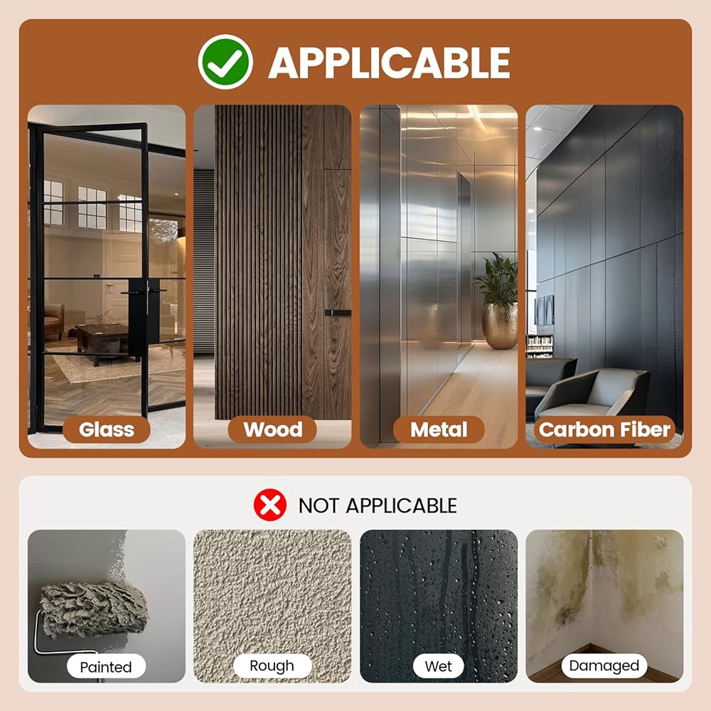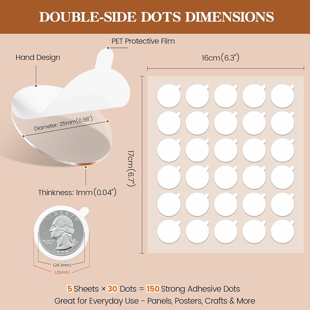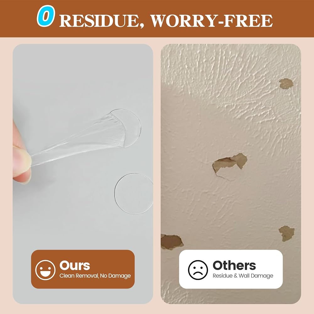• تصميم واضح وسري: تمتزج النقاط الشفافة بسلاسة مع الجدران والألواح، مما يحافظ على تركيبك أنيقًا واحترافيًا. على عكس الشريط أو الأظافر الكبيرة ذات الوجهين، فإنها تظل غير مرئية ولن تؤثر على مظهر غرفتك.