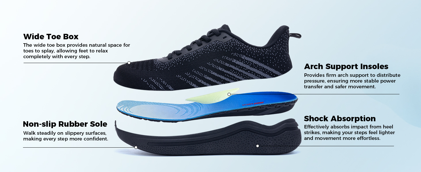 【حل متعدد الاستخدامات】: أصبحت أحذية الرجال التي تجمع بين دعم قوس القدم، وتصميم صندوق عريض عند الأصابع، ومقاومة الانزلاق، والتهوية، الخيار الأمثل للتنقل الحضري الحديث. إنها تتناسب بشكل جيد مع مجموعة متنوعة من الملابس السفلية، من السراويل الكاجوال إلى الجينز وحتى السراويل الرياضية، مما يوفر حلاً ذكيًا "حذاء واحد يناسب الجميع" لسيناريوهات متنوعة مثل نزهات نهاية الأسبوع أو رحلات العمل القصيرة أو أيام العمل المختلطة.