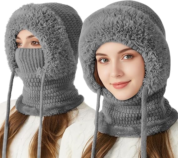 Stylish and Practical Design: With a sleek and modern look, this Hooded One Piece Windproof Warm Snow Cap features a chunky knit pattern and fluffy plush lining that complements any winter outfit while providing essential wind protection.