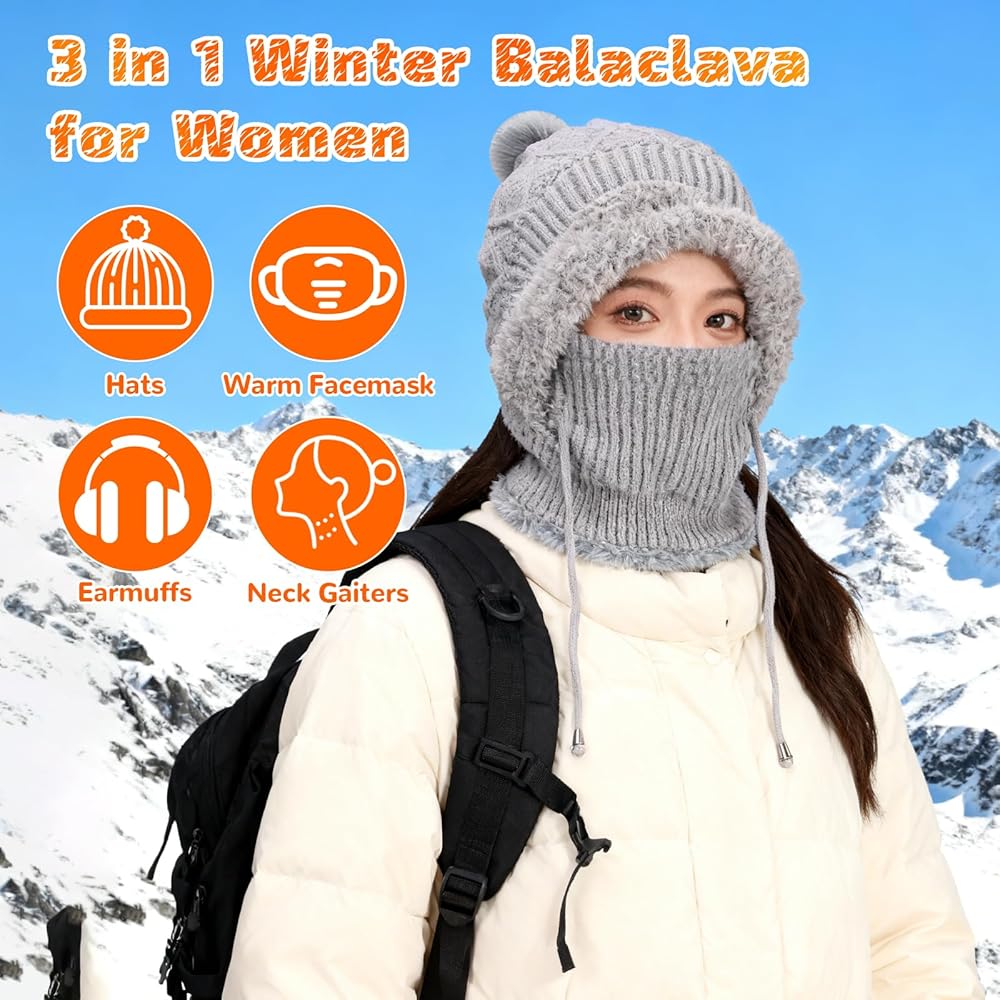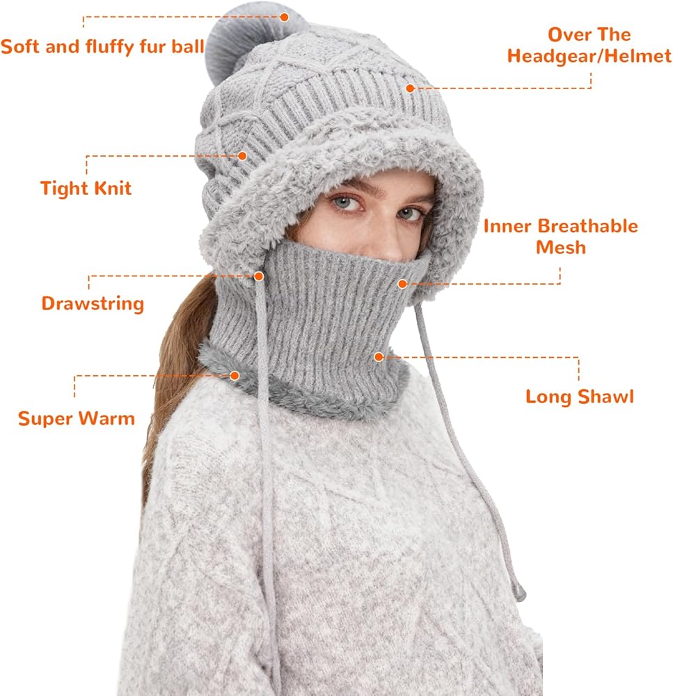 3 in 1 Beanie Hat with Scarf and Mask, Women's Outdoors Windproof Scarf Hat, Knitted Ski Mask Set