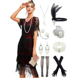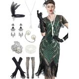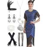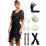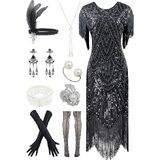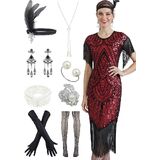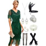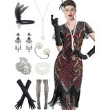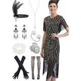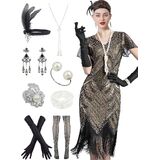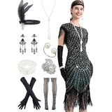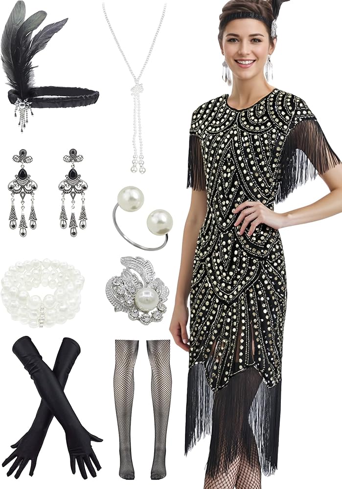 تصميم أنيق على طراز آرت ديكو: فستان Gatsby النسائي ذو الشراشيب الطويلة والترتر العتيق من عشرينيات القرن العشرين من طراز آرت ديكو يجسد أناقة العصر وبريقه بتصميمه المذهل المستوحى من فن الآرت ديكو. يتميز الفستان بتفاصيل معقدة من الترتر بنمط جميل يجسد الفخامة والرقي في عشرينيات القرن العشرين.
