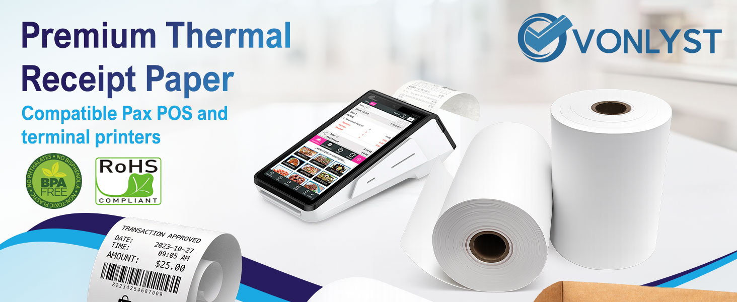 ورق الإيصالات الحرارية الفاخر من PAX - تتميز لفافات ورق الإيصالات الحرارية Vonlyst Pax الخالية من الحبر والخالية من التلطخ بطبقة ممتازة حساسة للحرارة لطباعة آلة بطاقات الائتمان بدون حبر. يُنتج إيصالات واضحة وواضحة وخالية من التلطخ لسجلات المعاملات الاحترافية. يتم فحص جودة كل لفة للحصول على أداء ثابت.