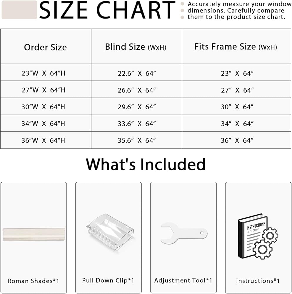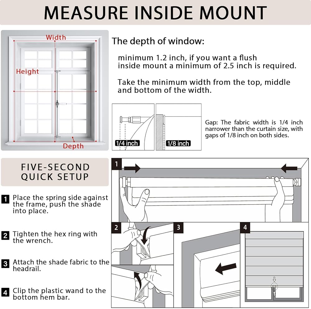 ملاءمة مثالية للتركيب الداخلي: تم تصميم هذه الظلال الرومانية التي لا تحتوي على أدوات أو حفر حصريًا للتركيب الداخلي. للحصول على تركيب داخلي أفضل، يتم خصم قياسي بمقدار 2/5 بوصة لعرض الظل. الحجم الفعلي للمكفوفين هو 33.6 بوصة عرض × 64 بوصة ارتفاع. تناسب عرض النافذة من 33.6 إلى 34 بوصة، وارتفاع الستارة قابل للتعديل من 0 بوصة إلى 64 بوصة. (يرجى ملاحظة) الحد الأدنى لعمق إطار النافذة 2 بوصة مطلوب للتركيب الداخلي.